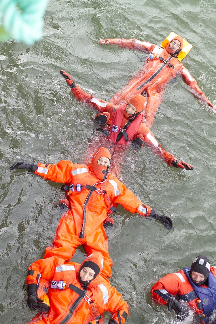 해상 탈출하여 구명조끼를 착용한 상태에서는, 얼굴과 전면이 하늘을 향하도록 도와줍니다.