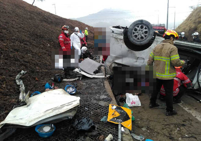 현재 사고 지점 나들목 진입은 통제된 상태로, 소방당국과 도로공사는 사고를 수습 중이다.