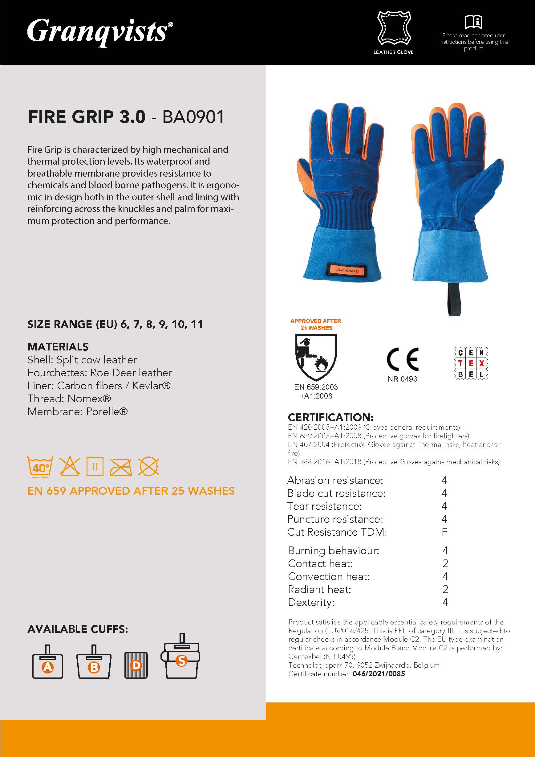 높은 열보호 성능과 기계적 저항력이 높습니다. 방수 및 통기성 멤브래인 구조는 화학물질 및 혈액 매개의 병원균에 대한 내성을 제공합니다. 최대한의 보호와 성능을 위해 손목과 손바득을 보강하는 외피와 안감 모두 인체 공학적 디자이이 적용되어 있습니다.