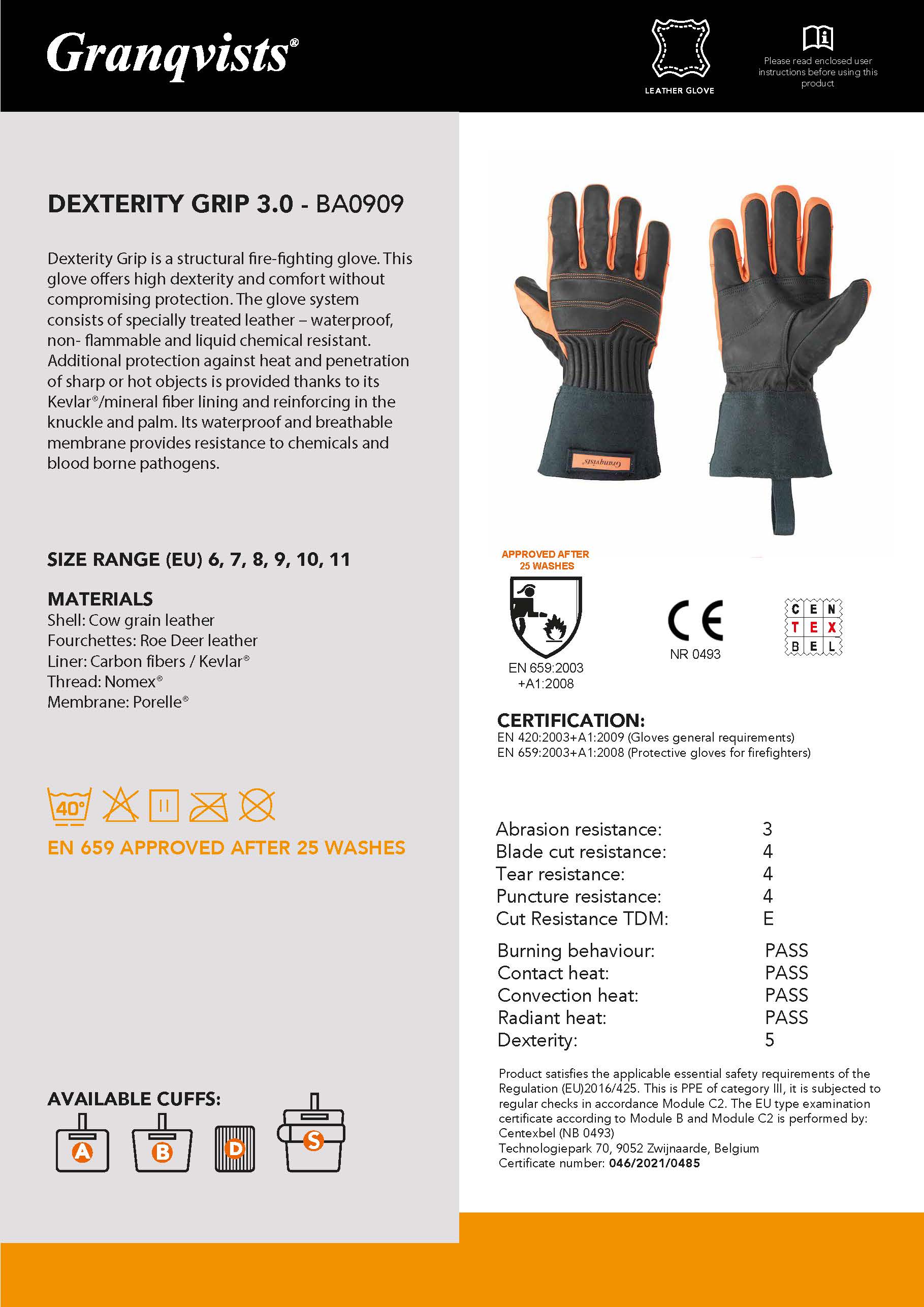 방수, 불연성, 내화학성으로 특수 처리된 가죽이 주요 재질이며 Kevlar과 광물섬유 라이닝 및 너클, 강화된 손바닥으로 열과 날카롭거나 뜨거운 물체의 침투를 보호해 줍니다. 또한, 방수 및 통기성 멤브레인은 화학물질 및 혈액등의 병원체에 대한 방호를 제공합니다.