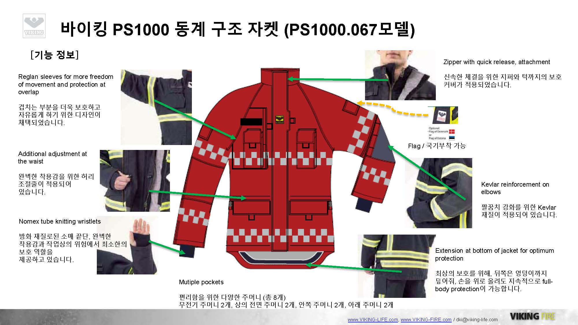 통기성, 투수(습)성, 열전도율 (불꽃, 복사열)이 뛰어난, 방화복 성능의 방한복, 정전기 특성을 감안하여 방지하는 성능, 뛰어난 디자인과 우수한 착용감!