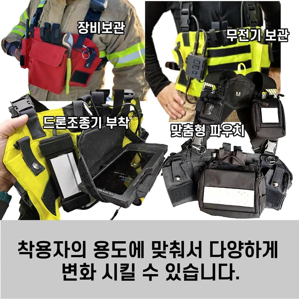 총 4가지 색상 중 선택할 수 있으며 기본적으로 벨트와 무전기 파우치가 부착되어있는 전면파우치로 구성되어있으며 필요에 따라 별도의 파우치를 부착할 수 있습니다.