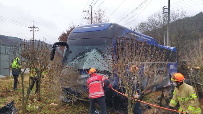 [홍천=뉴시스] 김경목 기자 = 9일 오전 강원도 홍천군 남면 화전리 494번 지방도에서 러시아 국적 등 외국인 노동자 3명이 탄 SUV 차량과 대명 비발디파크 통근버스가 충돌했다. 이 사고로 외국인 노동자 3명이 숨지고 비발디파크 직원 7명이 크고 작은 부상을 입었다. (사진=강원도소방본부 제공) 2021.11.09. photo@newsis.com