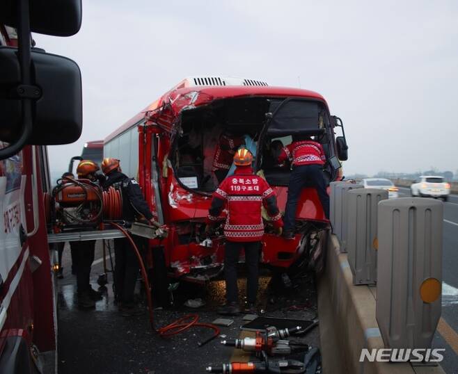 [청주=뉴시스] 조성현 기자 = 29일 오전 7시17분께 충북 청주시 청원구 외평동 한 도로에서 A(54)씨가 몰던 45인승 버스가 앞서가던 B(46)씨의 굴착기를 추돌했다.