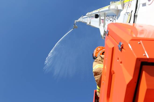 (대구=연합뉴스) 김선형 기자 = 고층 건물 화재 발생에 대응하기 위한 70m 높이 굴절 사다리차가 대구에 잇따라 배치되고 있다.