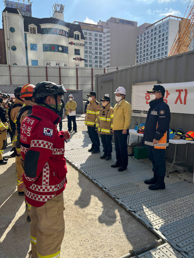 [서울=뉴시스] 추상철 기자 = 안경덕 고용노동부장관과 이흥교 소방청장이 2일 오후 광주 신축공사 아파트 붕괴사고 현장을 찾아 현장을 점검하고 119구조대원들을 격려하고 있다. (사진= 소방청 제공) 2022.02.02. photo@newsis.com *재판매 및 DB 금지