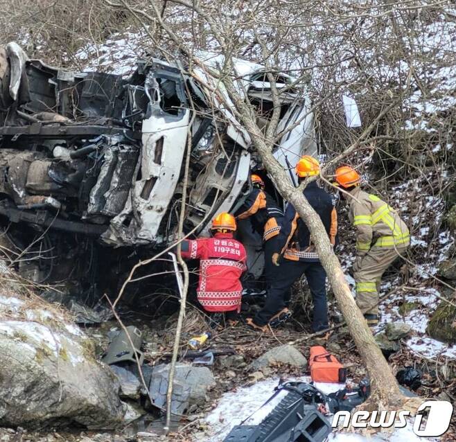 (횡성=뉴스1) 이종재 기자 = 11일 오후 3시 23분쯤 강원 횡성군 안흥면 안흥리의 한 도로에서 A씨(60대)가 몰던 25톤 트럭이 가드레일을 들이받고 20m 아래 하천으로 추락하는 사고가 났다.