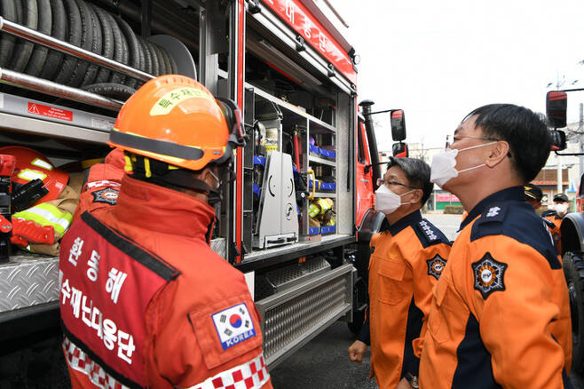 [서울=뉴시스] 이흥교(가운데) 소방청장이 21일 강원 강릉시 환동해특수재난대응단을 방문해 산불 진화 장비를 점검하고 있다. (사진=소방청 제공) 2022.02.21. photo@newsis.com