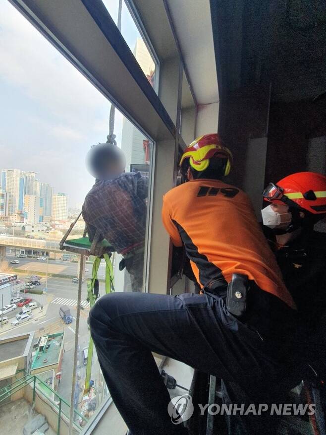 (부산=연합뉴스) 지난 23일 오후 3시 43분께 부산 부산진구 한 종합병원 신축건물 8층에서 외벽 작업을 하던 중 고립된 근로자를 119 대원이 구조하고 있다. 119 대원은 창문을 통해 근로자를 안전하게 건물 내부로 옮겼다. 2022.3.24 [부산소방본부 제공. 재판매 및 DB 금지]