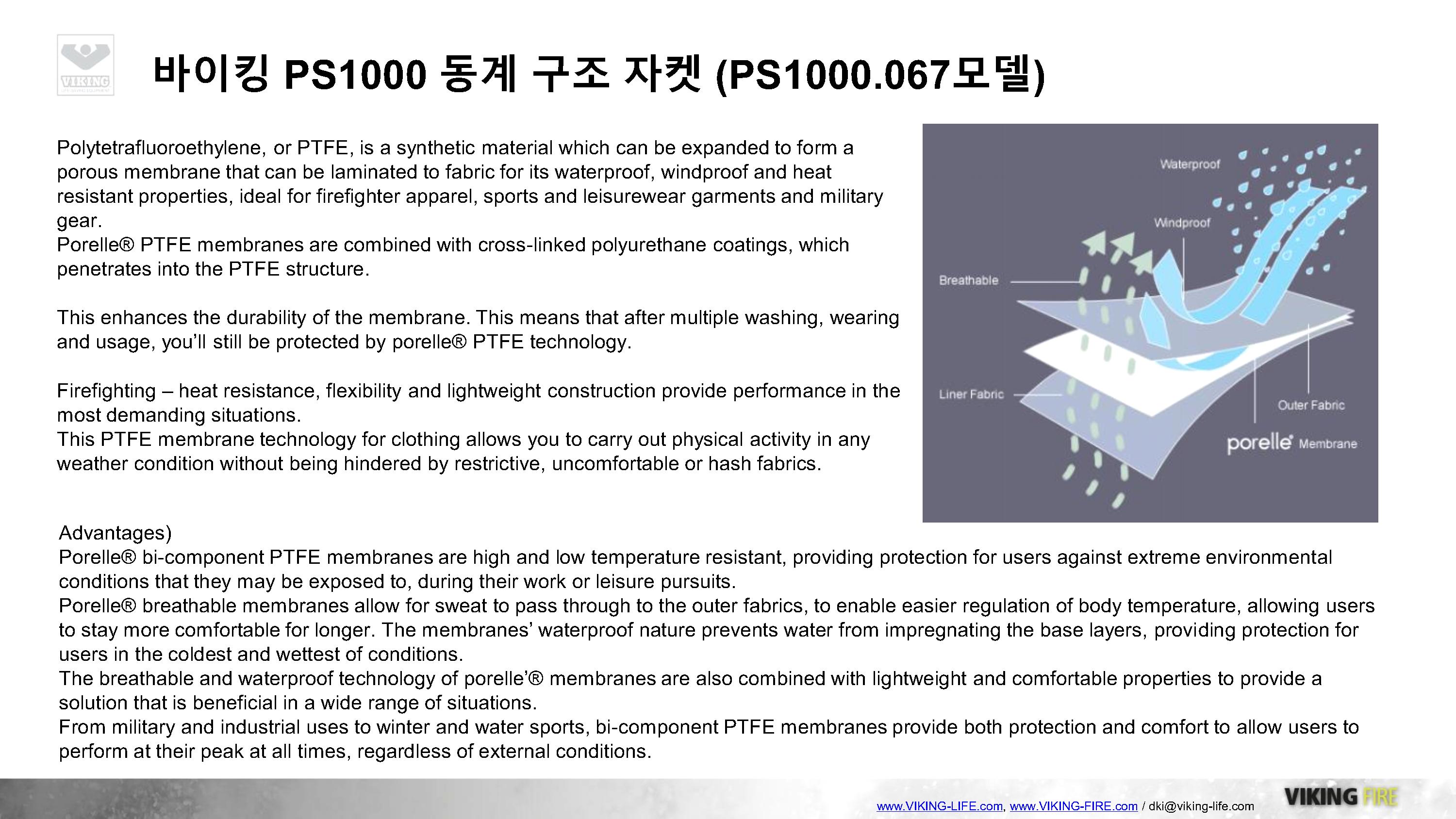 통기성, 투수(습)성, 열전도율 (불꽃, 복사열)이 뛰어난, 방화복 성능의 방한복, 정전기 특성을 감안하여 방지하는 성능, 뛰어난 디자인과 우수한 착용감!
