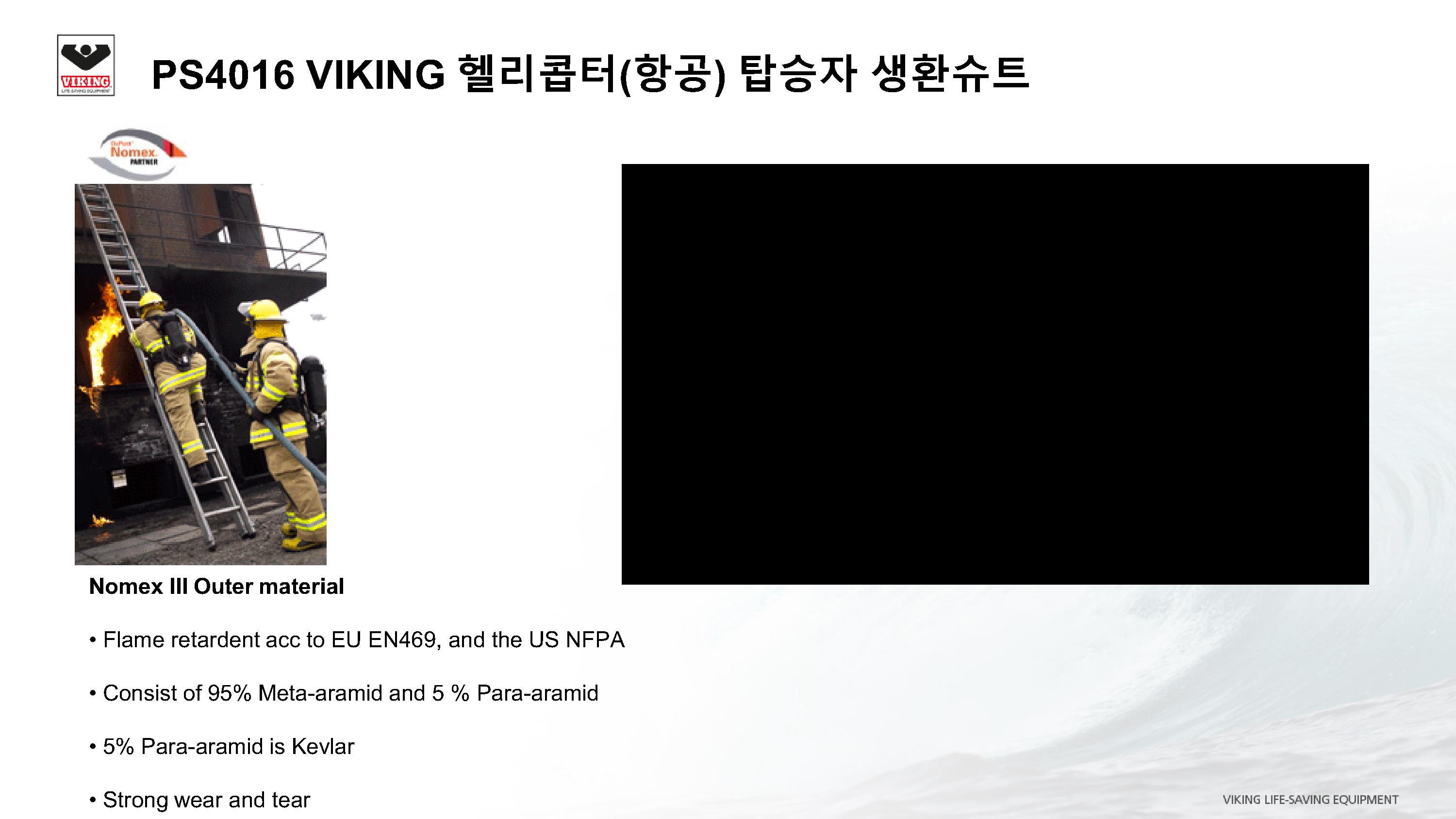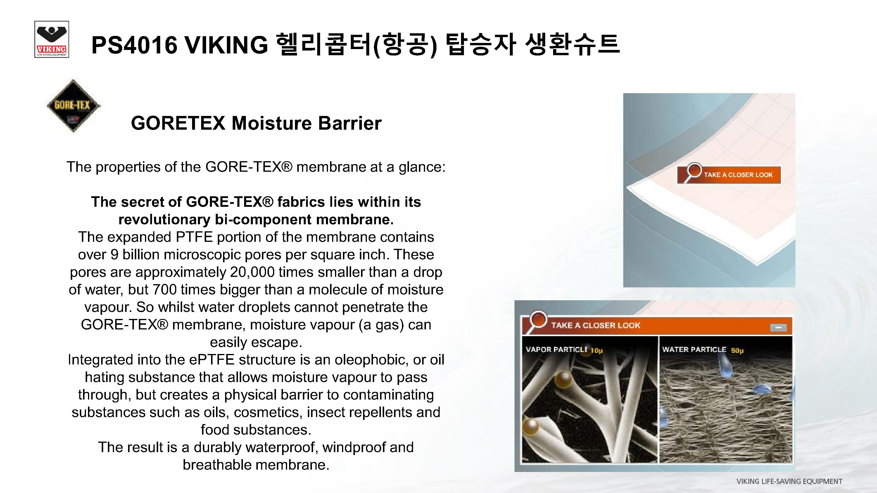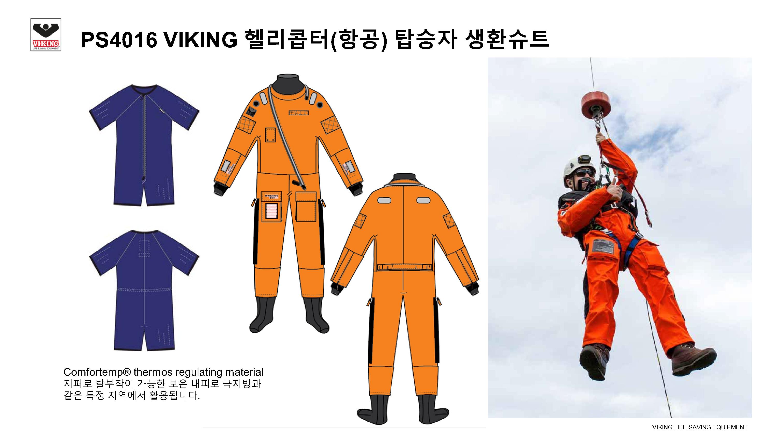 헬리콥터(항공기) 탑승자/정비사 전용 슈트(생화복)는 체온을 유지시키며 자체 부력으로 물에 뜰 수 있도록 기술되어 있으며, 장시간 착용에도 불편함이 없도록 내부의 열과 땀을 밖으로 배출시키는 GORE-TEX를 기반으로 구성되어 있습니다.