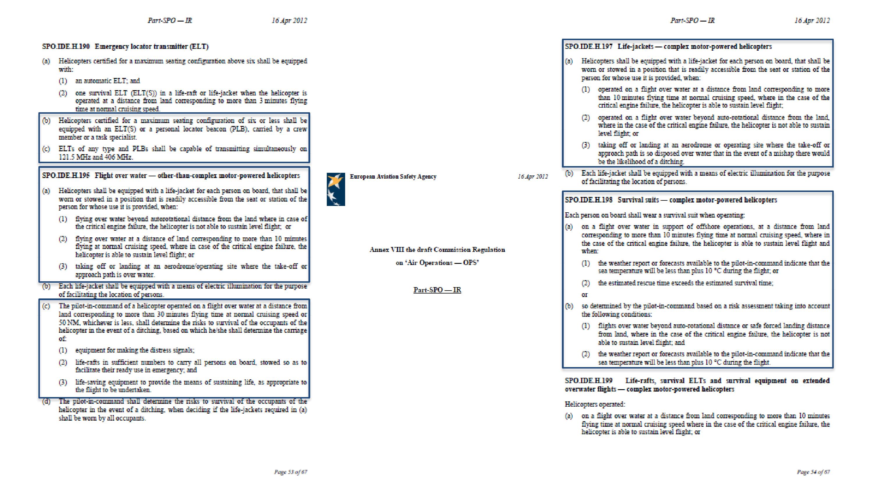 'Air Operations - OPS' 규정을 기반하여, 10분 이상의 해상/수상 비행이 요구되거나 항공기의 예기치 않는 문제로 해상/수상에 디칭(비상착륙)이 요구되는 상황을 대비하여, 해상 온도가 10도이하거나 신속한 구조를 기대하기 어려운 상황, 또는 항공기의 안전 관리자의 결정으로 헬리콥터 슈트(생환복)를 보유하도록 권고하고 있습니다.