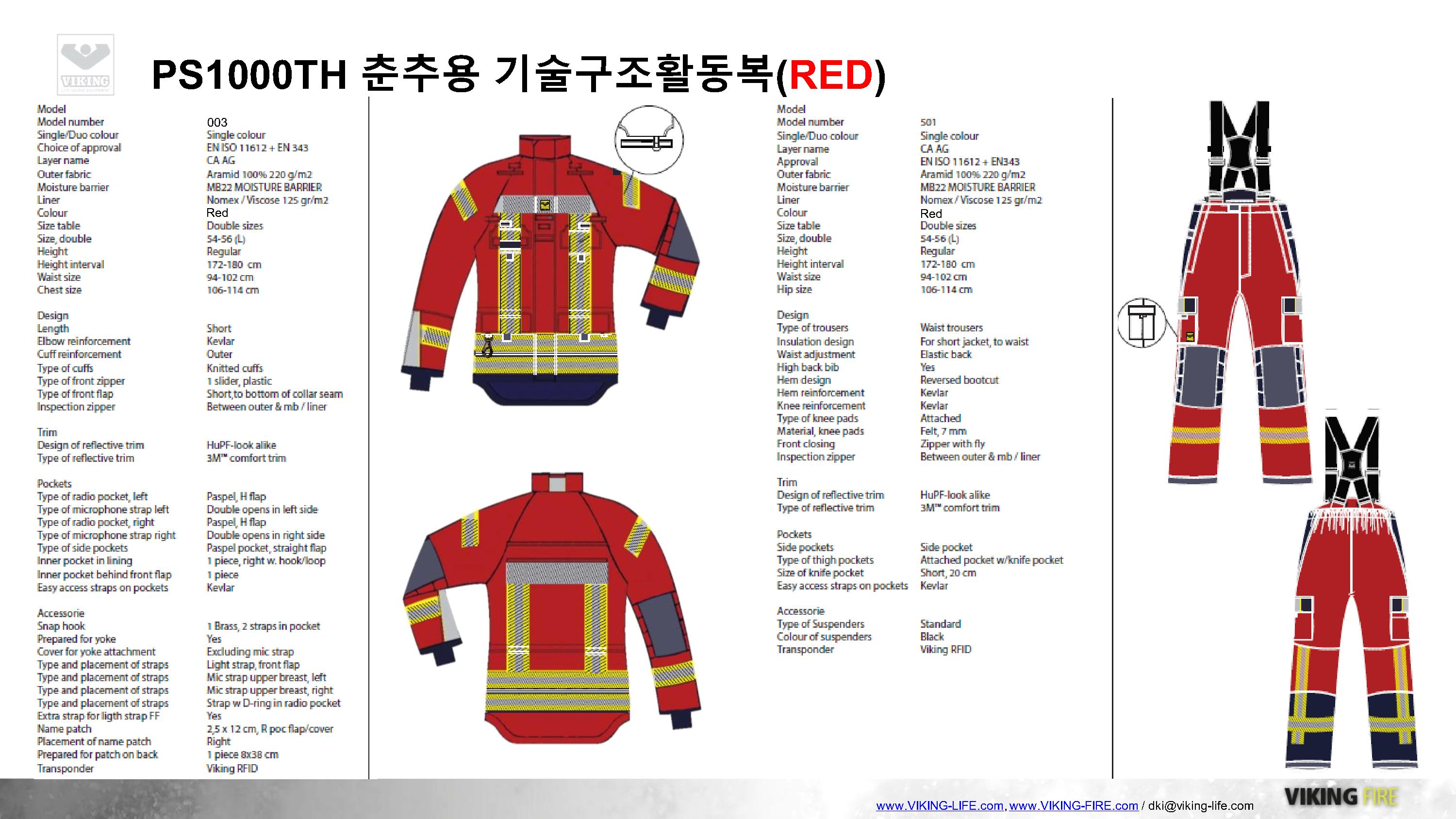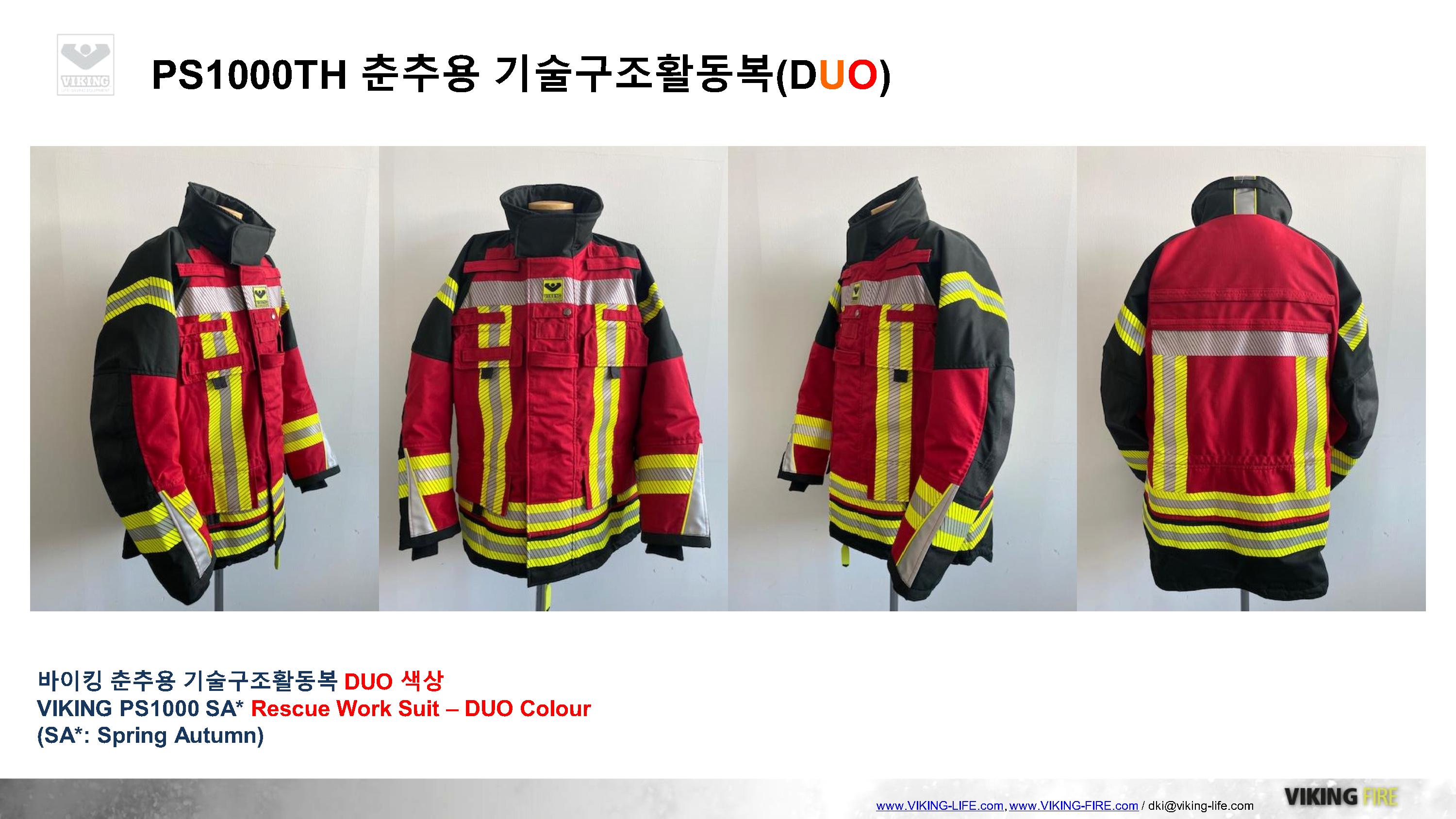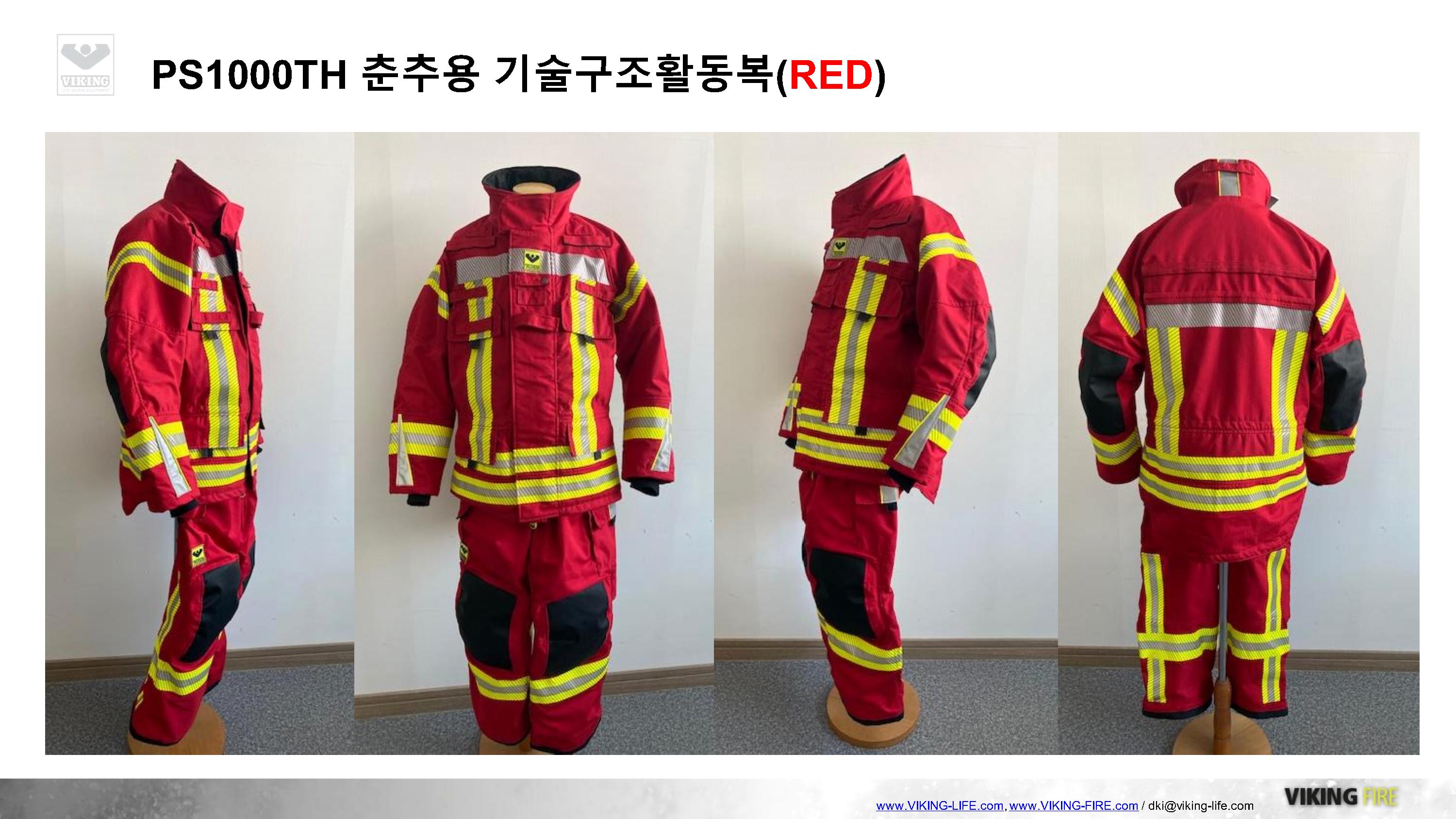 현장 대원들의 작업 내용의 최대 90%까지는 사실상, 강력한 화재 및 폭발 등으로부터의 보호를 요구하지는 않습니다. 대신, 신속하고 자유로운 움직임을 보장하고 충분한 보호를 받을 수 있도록, 오랜시간 동안 구조 및 현장 작업에 전념할 수 있는 보호복(구조복)이 필요합니다. 바이킹 춘추용 기술구조활동복 TH SUIT 모델은 최근에 EN469(low level) 방화복 인증을 추가 하였습니다.