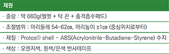 이 헬멧은 머리를 들지 않고도 상부 시야각을 최대한 확보할 수 있도록 설계됐다는 게 특징입니다. 또 특수한 구조의 내부 곡면판(shell)은 낙상 등의 충격으로부터 두개골 골절을 보호하고 척추에 직접 전달되는 충격까지 최소화해줍니다.