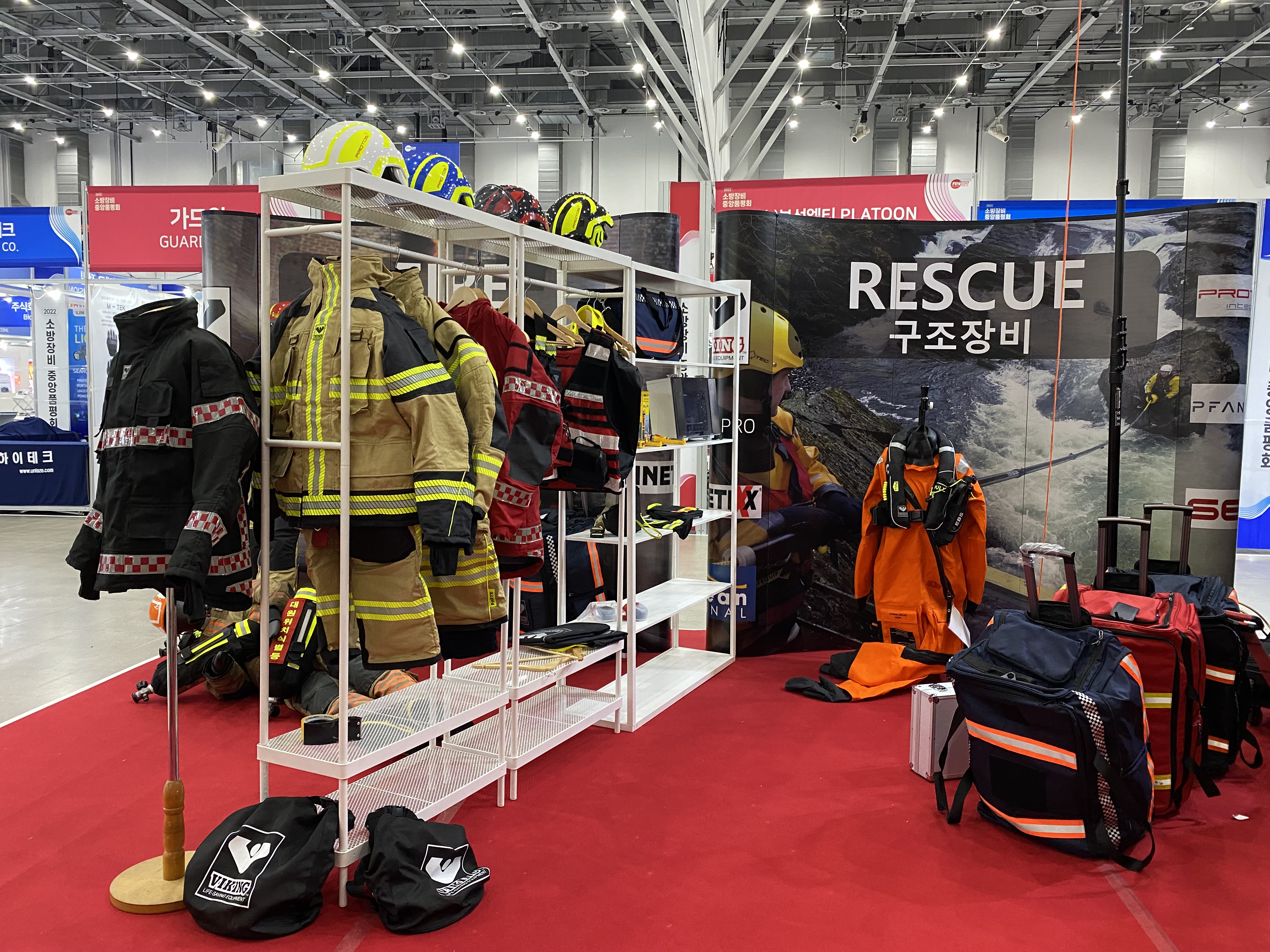 여러군데 비치되어 있는 바이킹을 찾아주십시오. 전시된 항목들은 승인과 인증을 기준으로, 이미 현장에서 활용되어 대원분들에 도움을 받는 모델들입니다. 직접 착용해 보시고 느껴보십시오.