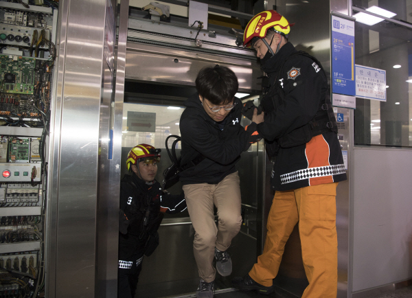 승강기 갇힘 사고 때 대처 방법도 중요하다. 먼저 승강기 안 인터폰으로 외부에 도움을 요청하고, 작동이 안 되면 119로 신고해 승강기 일련번호를 알려야 한다. 휴대전화도 없으면 큰 소리로 주변에 자기가 갇힌 사실을 알릴 필요가 있다. 부산소방본부 관계자는 “문을 열어 탈출하거나 천장 비상 환기구로 탈출하는 행동은 자칫 추락사고로 이어질 수 있다. 신고 후 침착하게 구조를 기다려야 한다”고 말했다.