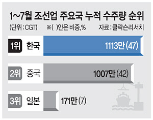 올해 누적 기준(1∼7월)으로도 한국은 1113만 CGT(204척)로 중국(1007만 CGT)을 앞서고 있다. 5월까지 누적 수주 점유율은 한국 45%, 중국 44%로 거의 비슷했지만 지난달을 기준으로는 각각 47%, 42%로 격차가 벌어졌다.