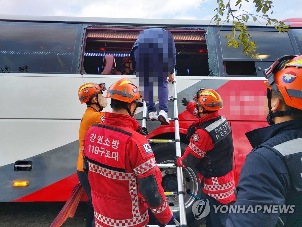 (강릉=연합뉴스) 29일 오후 1시 5분께 강릉시 사천면 덕실리 농로에서 대형버스의 뒷바퀴가 길옆으로 이탈하면서 기울어져 출동한 119구조대원들...