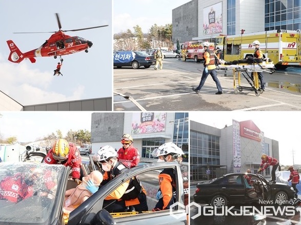 충주시와 충주소방서 주관으로 실시된 훈련에는 충주경찰서, 군부대, 충주119화학구조센터, 한전 등 20개 유관기관·단체 260여 명이 참여했으며, 헬기, 드록, 소방 및 구급 차량 등 총 44대의 장비가 동원됐다.