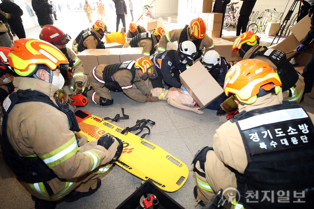 경기도는 지난 8일 오전 롯데백화점 수원점 2층에서 1층으로 내려오던 에스컬레이터에서 역주행으로 인한 압사사고가 발생하는 상황을 가장한 ‘사회재난 경기도 기관 합동훈련’을 실시했다. 이날 훈련에는 경기도와 도소방재난본부, 경찰, 한전, KT 등 32개 기관 500여명이 참여했으며 헬기 3대 등 장비 85대가 동원됐다.