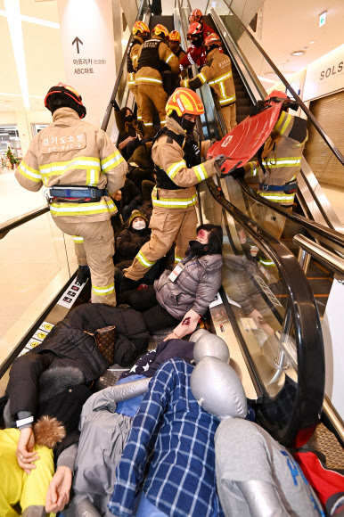 119 구조대원들이 8일 경기 수원시 권선구 롯데몰 수원점에서 열린 ‘2022 사회재난 합동훈련’에서 에스컬레이터 역주행으로 인한 압사 사고를 가장한 인명 구조 훈련을 하고 있다. 10·29 이태원