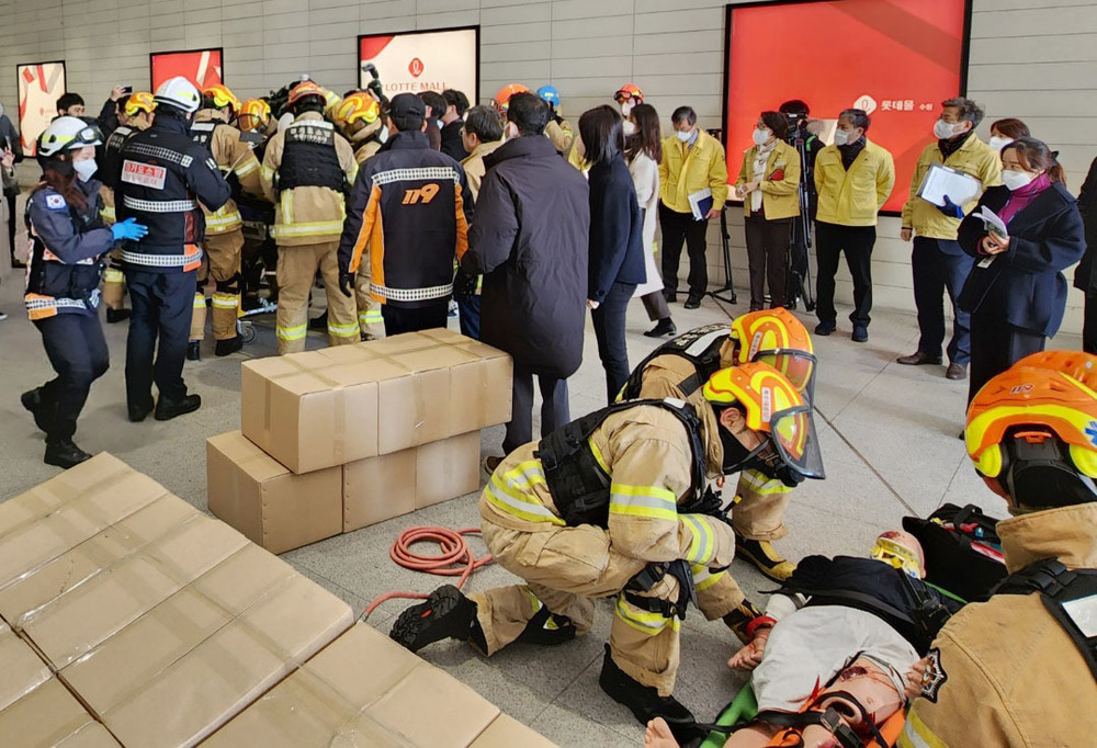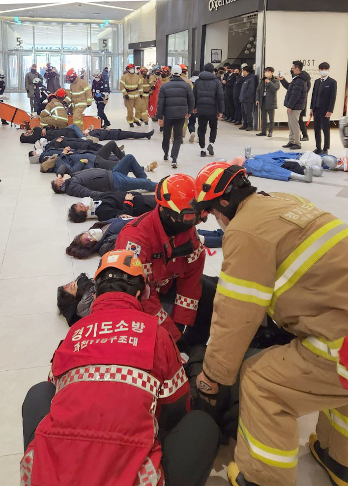 그런데 얼마 후 쇼핑몰 내부 가벽이 붕괴했다. 외부에선 대형버스와 승용차 간 교통사고가 발생했다. 모두 가정이었지만 현장에 있는 소방·경찰 등 300여명의 구조 인력은 곧장 분산해 대처했다. 이들은 무너진 벽을 에어백 등을 통해 매몰된 사람들을 구조하는 동시에 버스와 승용차에 갇혀 고통을 호소하는 사람들을 신속히 구조했다. 위급한 환자의 경우 병원으로 이송할 헬기까지 동원됐다.