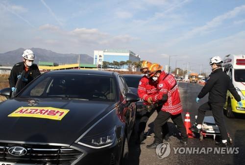 (광주=연합뉴스) 손상원 기자 = 광주 지방자치단체와 소방, 경찰 등이 폭설 대응 체계를 점검한다. 광주시는 6일 용두∼담양 도로 개설공사 구간에서 기습 폭설로 인한 도로정체 대응 훈련을 한