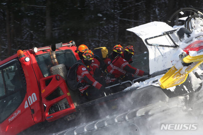 [평창=뉴시스] 김경목 기자 = 19일 오후 강원도소방본부 119특수구조단 대원이 강원 평창군 알펜시아 리조트 스키장에서 열린 리프트 멈춤 사고 대응 훈련에서 인명구조를 하고 있다. 이날 훈련은