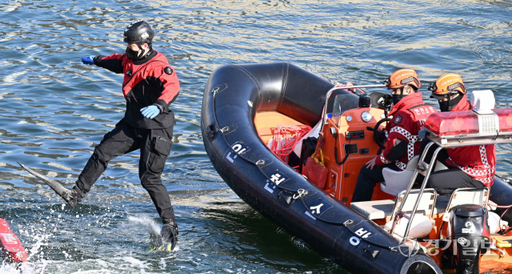15일 오전 인천소방본부 119특수대응단 대원들이 인천 서구 경인아라뱃길 정서진 수난구조대 앞에서 물에 빠진 시민을 구조하는 훈련을 하고 있다. 이날 훈련은 해빙기를 맞아 수난 사고에 대응