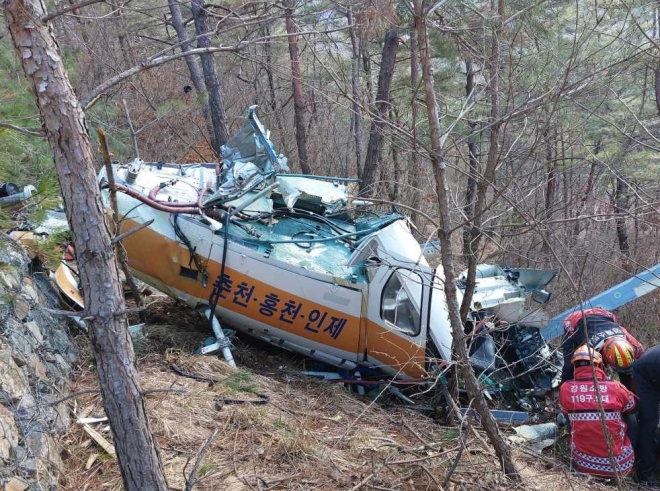 15일 오전 7시 46분쯤 강원 영월군 북면 공기리의 한 야산에 헬기가 추락해 동체 등 잔해가 흩어져 있다. 이 사고로 조종사 등 2명이 숨졌지만 화재, 파편 등에 의한 2차 피해는 발생하지 않았다. 소방 당국은 이 헬기가 송전탑 유지보수 공사에 쓸 자재를 운반하다가 송전선로에 걸려 사고를 당한 것으로 추정했다.