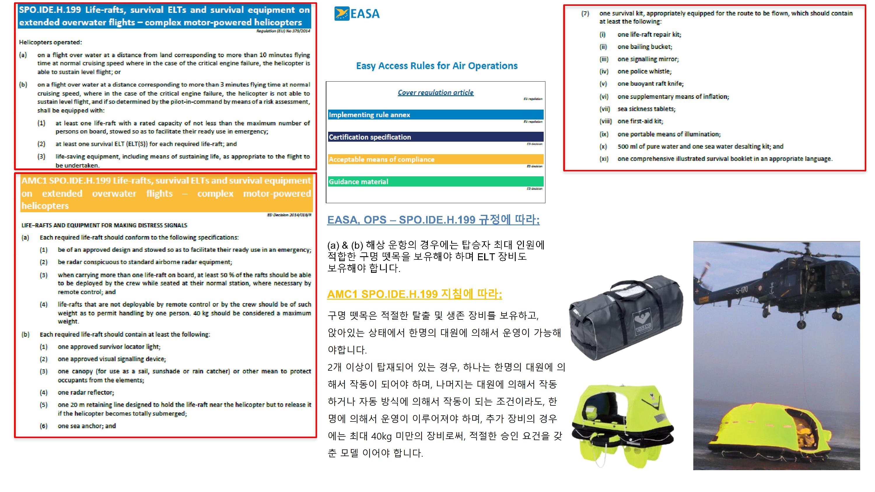 참고로, OPS 항공기(헬리콥터.H.) 장비보유 지침상에서 하늘색(Implementing rule annex)는 규정, 남청색(Certification specification)은 기술승인요건, 오랜지색(Acceptable means of compliance)는 지침에 만족할 수 있는 근거, 녹색(Guidance material)은 가이드라인으로 인지하시면 됩니다.