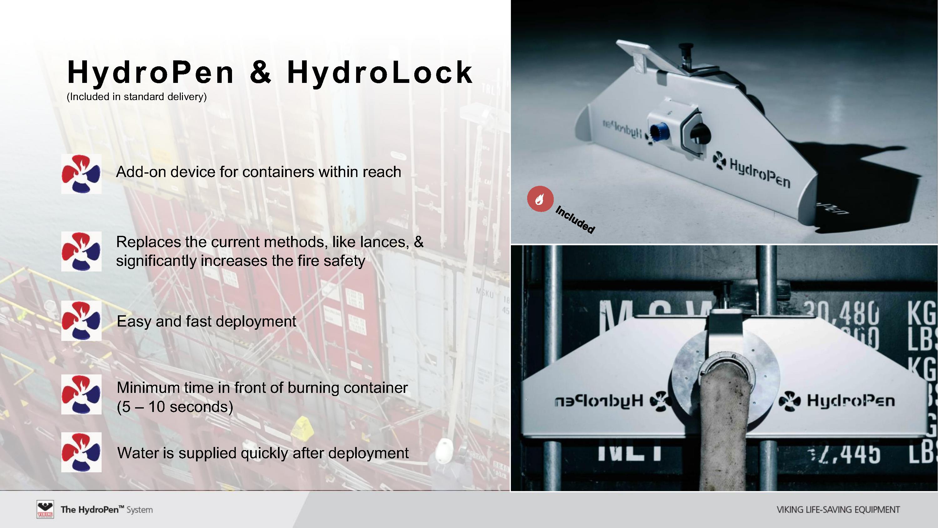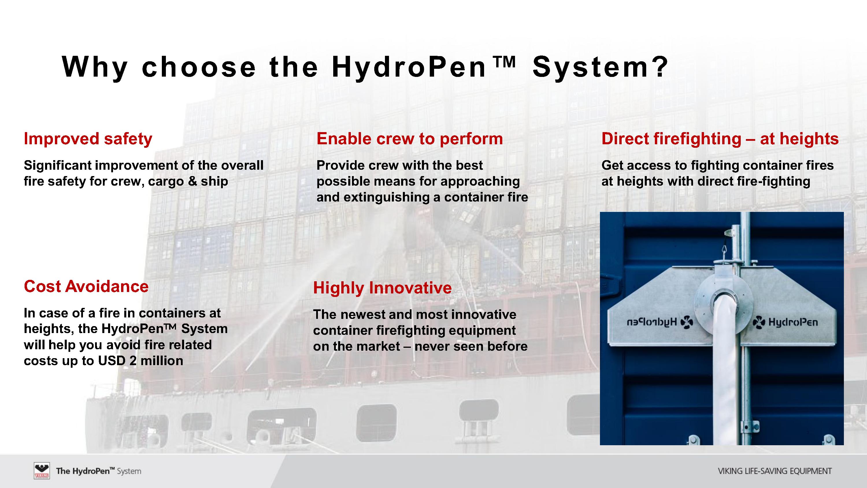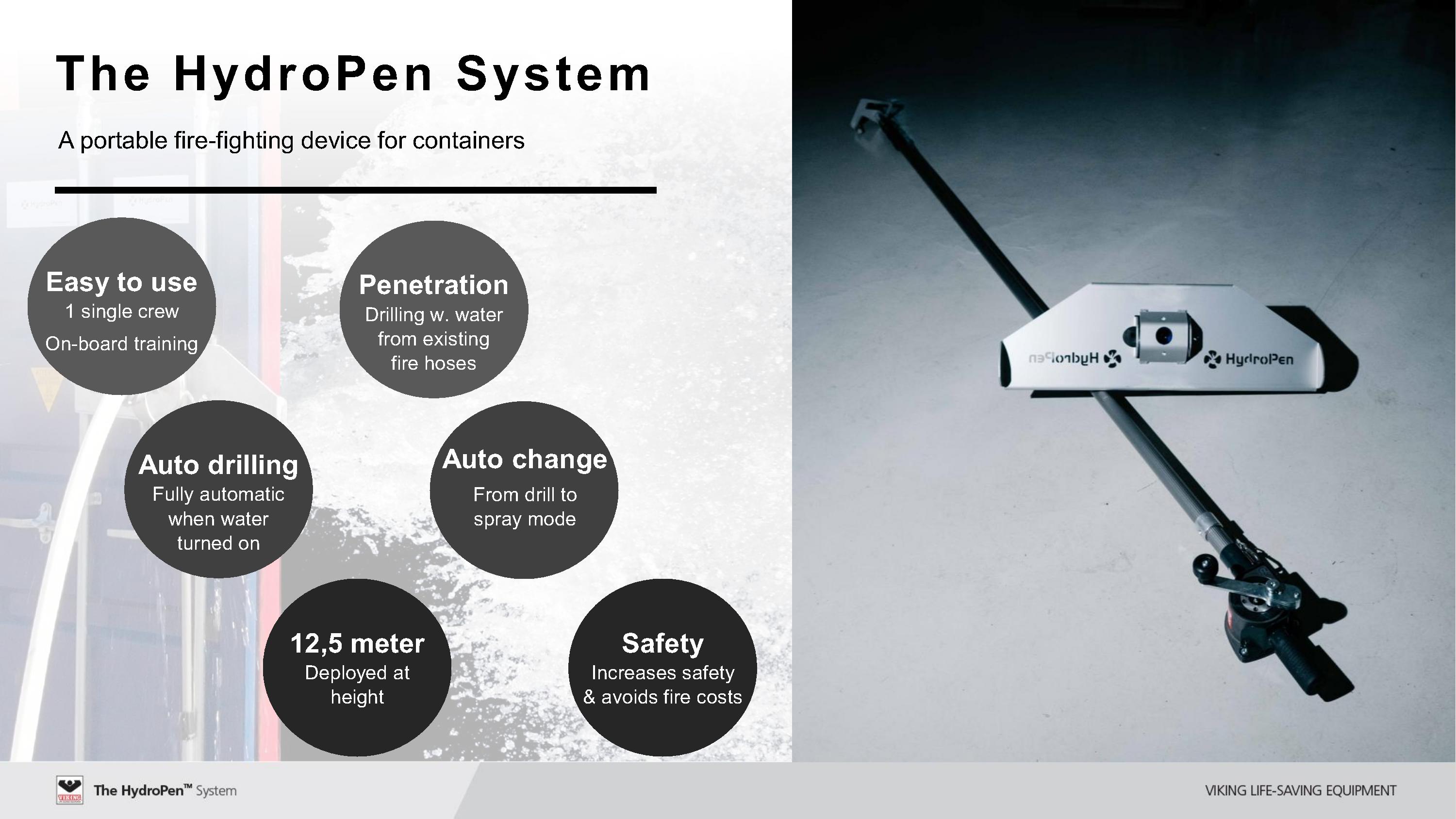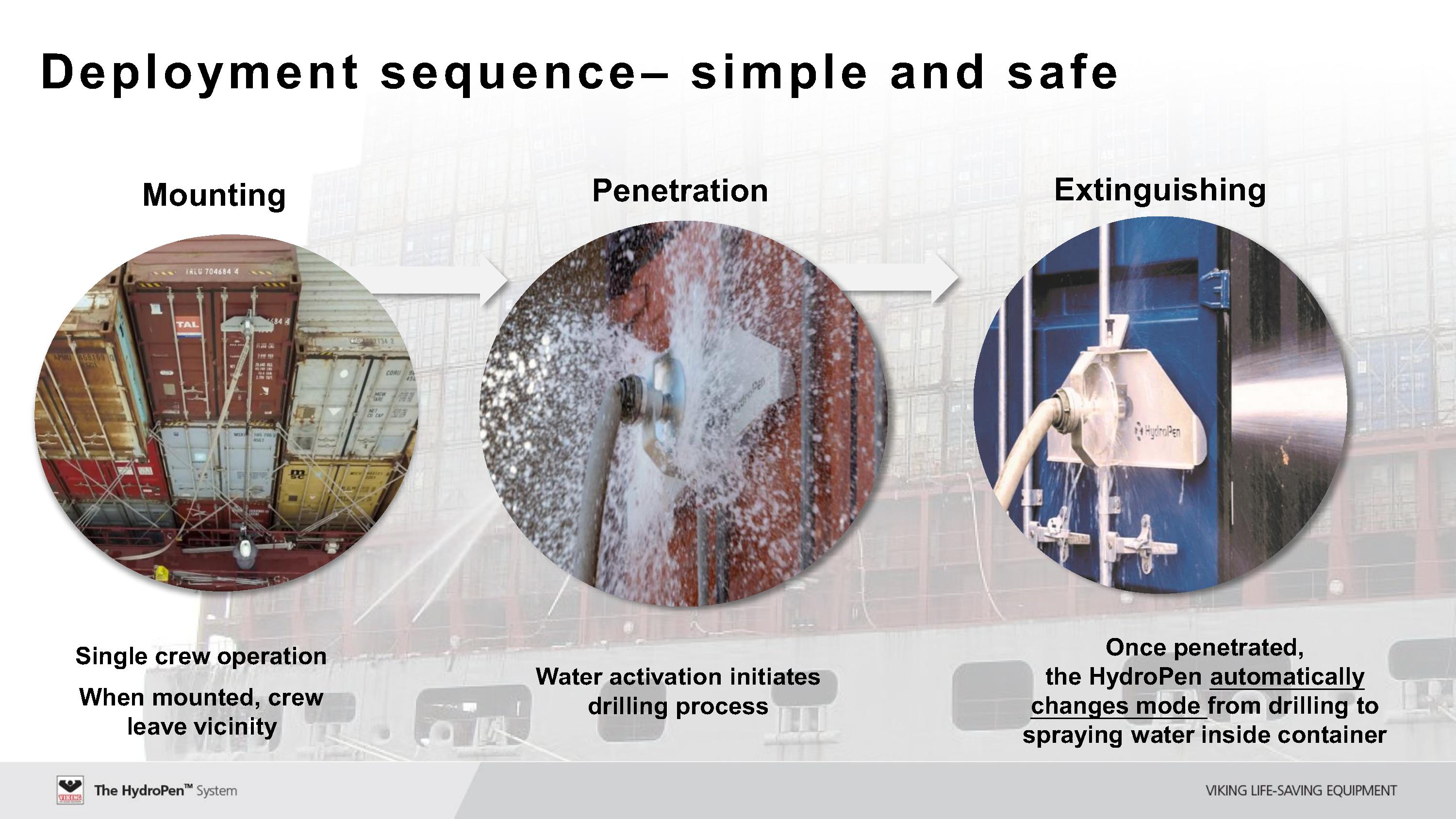바이킹의 하이드로팬 시스템은, 아무리 높이 적재된 컨테이너 내부에 화재가 발생하더라도, 하이드로팬을 이용하여 화재가 발생한 컨테이너에 바로 걸어서, 컨테이너를 뚫어서 내부의 화재를 진화할 수 있는 장비입니다.