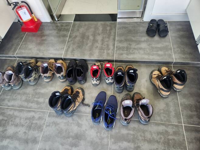지난해 발생한 울진 산불처럼 산불의 규모가 크면 해당 지역뿐 아니라 인근 지역을 담당하는 산불재난특수진화대원들까지 출동한다. 한자리에 모인 대원들은 이때 서로의 진화복과 신발, 안전모, 장갑 등 안전장구를 보면서 비교할 기회를 갖는다. 더 튼튼하면서도 가뿐한 신발, 경량화해 머리에 가해지는 하중이 덜한 안전모 등 더 나은 장비의 존재를 확인하는 순간이기도 하다.