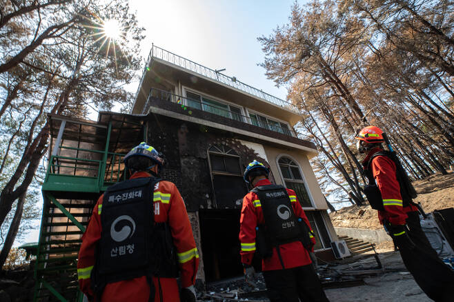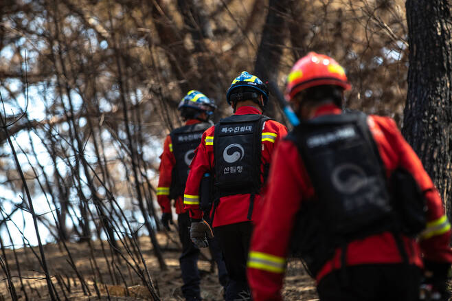산림청 소속 공무직(무기계약직)·계약직인 이들을 비롯해 산불 진화 인력은 지난해 7월 고용노동부가 정하는 ‘필수업무 종사자’로 분류됐다. 국가재난에 대응하는 필수 업무로 분류됐다고 해서 처우나 지원이 당장 달라진 것은 없다고 대원들은 말한다. 앞서 국가직으로 전환된 소방대원들이 입는 방화복은 조달청 공개 입찰을 거치기 때문에 옷의 성능 등이 시스템 안에서 관리된다. 반면 산불진화대원들의 진화복과 장비는 관리소별로 수의계약을 하고 있어 제각각인 데다가 품질 관리도 미흡하다는 지적이 나온다.