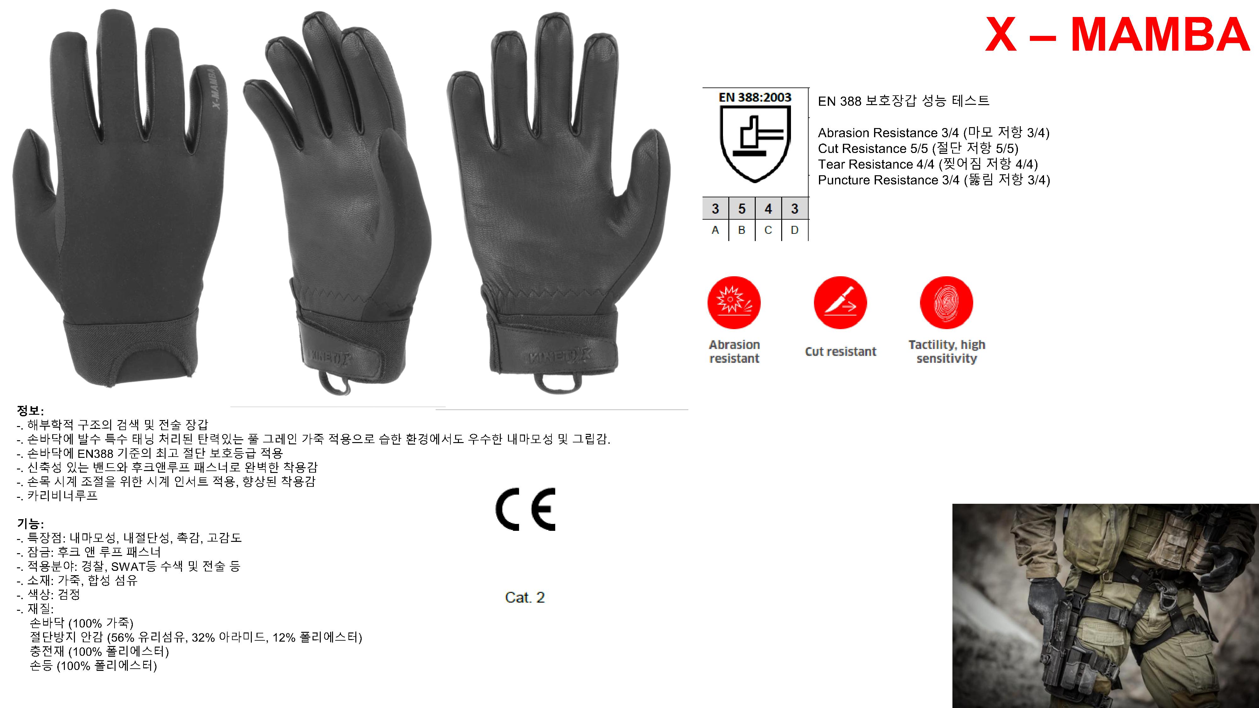 EN388 보호성능에서 마모저항(3/4), 절단저항(5/5), 찢어짐저항(4/4), 뚫림저항(3/4)의 안전성을 제공하면서도 우수한 착용감으로 다양한 전술 활동에 적합합니다.