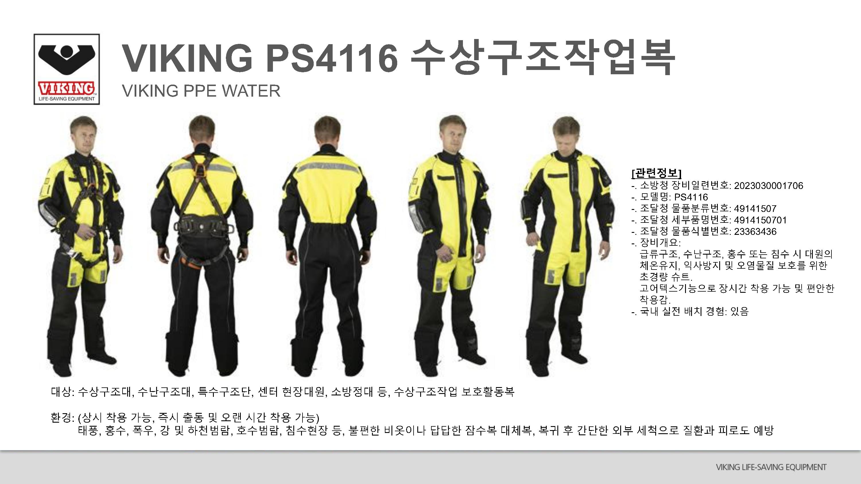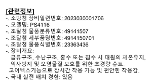 기억할건, 소방청 장비일련번호 2023030001706으로 PS4116모델이 자연재난현장에 대처할 수 있는 모델로, 수해에 관련된 현장에 즉각 대처할 수 있는 구조활동복으로, 비옷대신 보호복으로 적용할 수 있습니다.