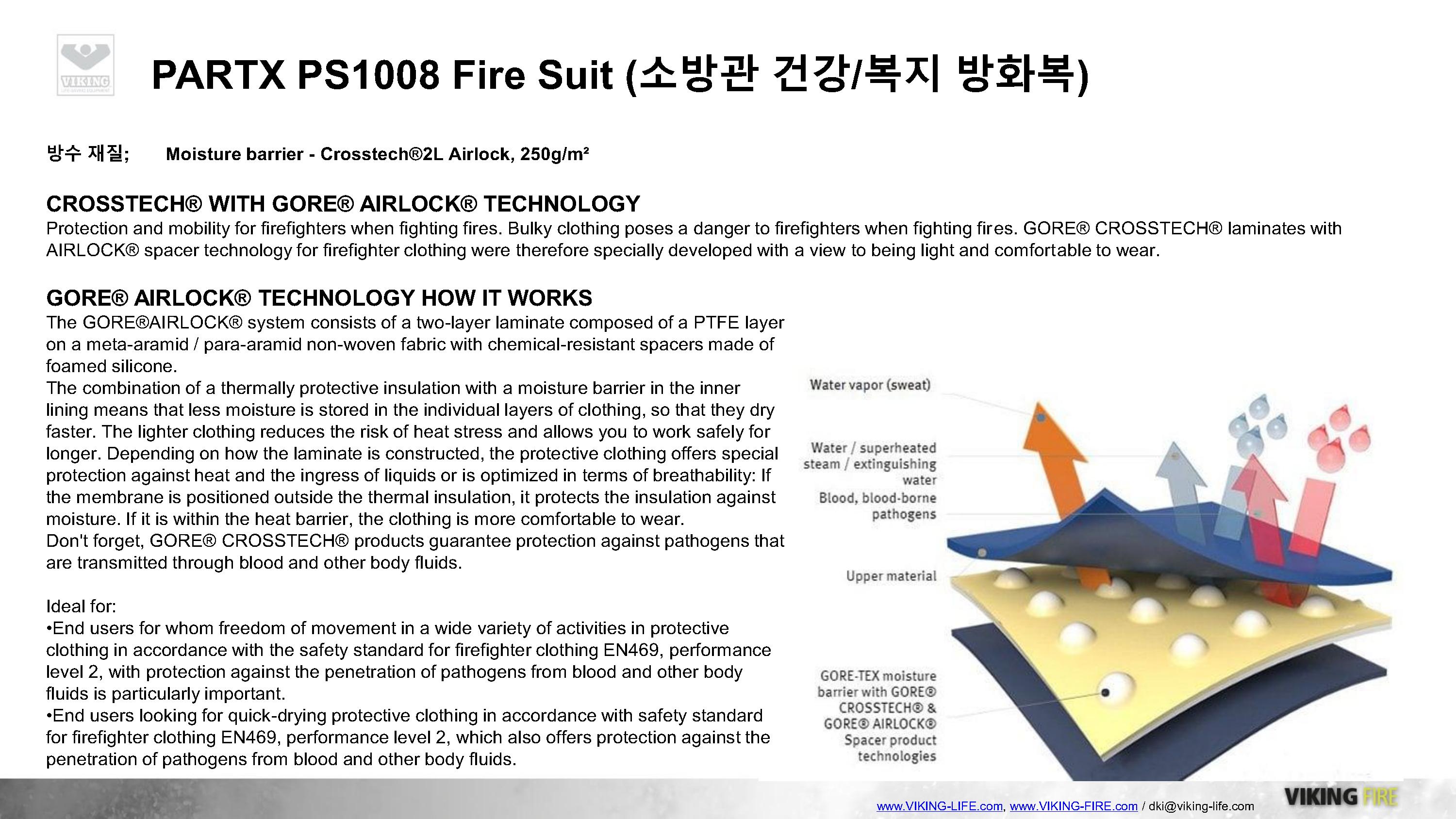 -. PBI Y55 Powershell, Crosstech Airlock등 방화복의 기능을 넘어서 편의성을 제공합니다.