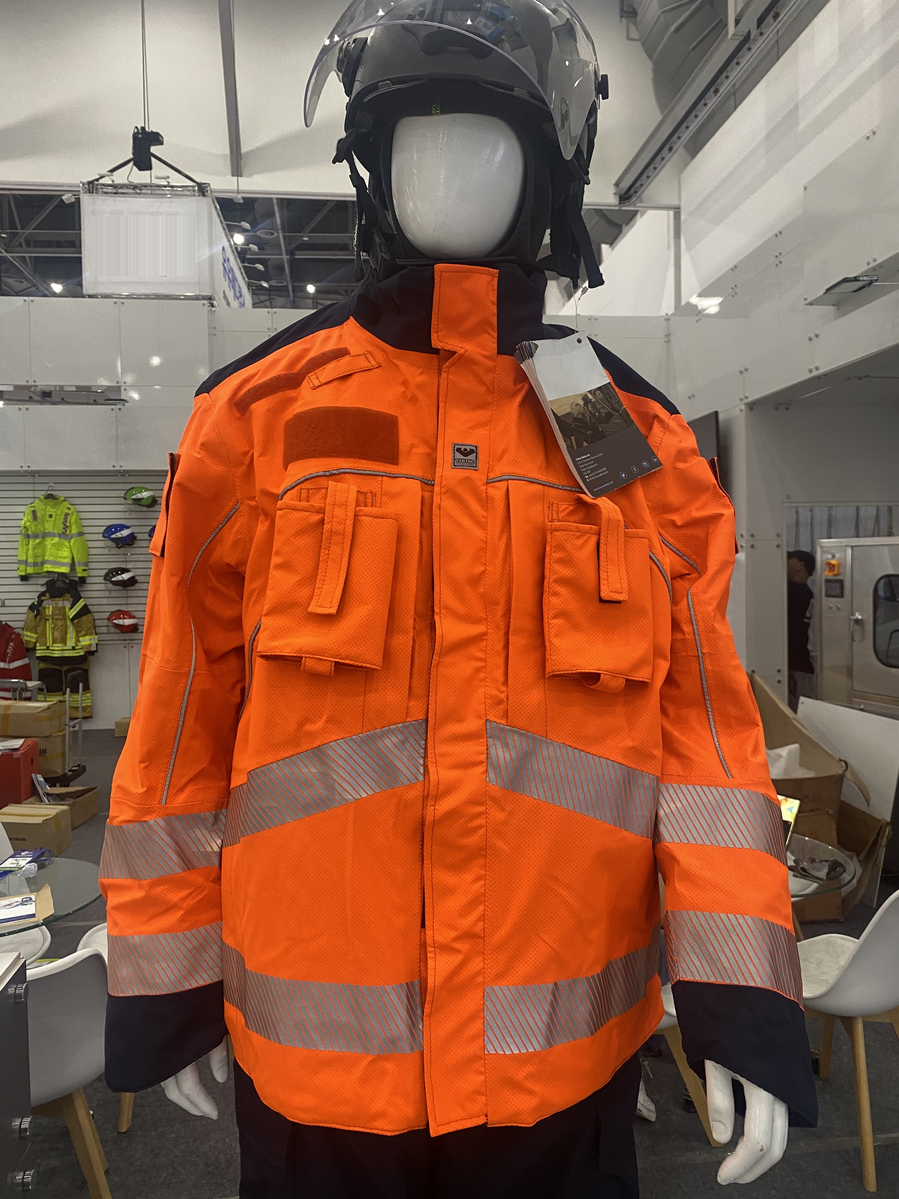 이 모델은 대한민국 해외긴급구호대(KDRT)의 구조팀을 위한 신형 구조복으로, 긴급으로 제작되어 전시회에 선보였습니다.
