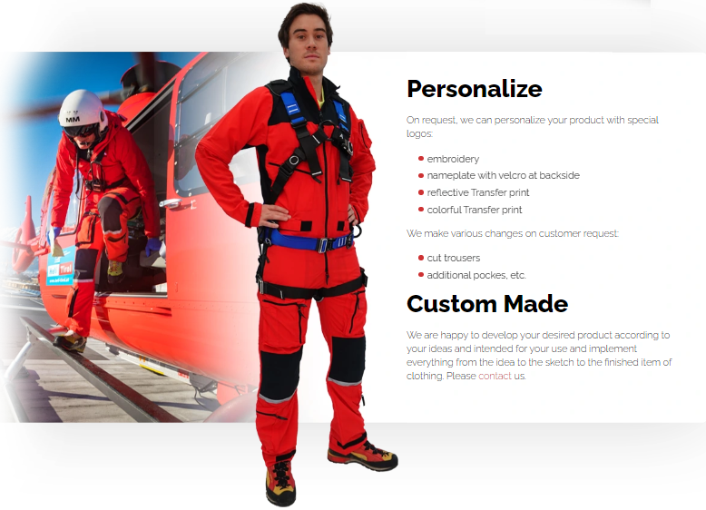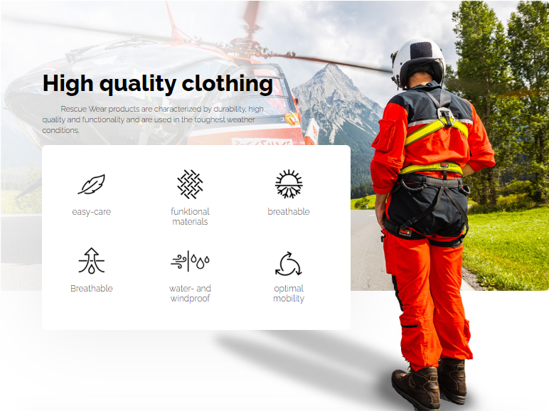 간단한 관리, 기능성 소재, 통풍 및 방수기능, 여기에 편안한 착용감으로 활동성이 뛰어난, 항공구조구급 및 산악구조용 특색을 갖춘 전문적인 구조구급활동복이 있습니다.