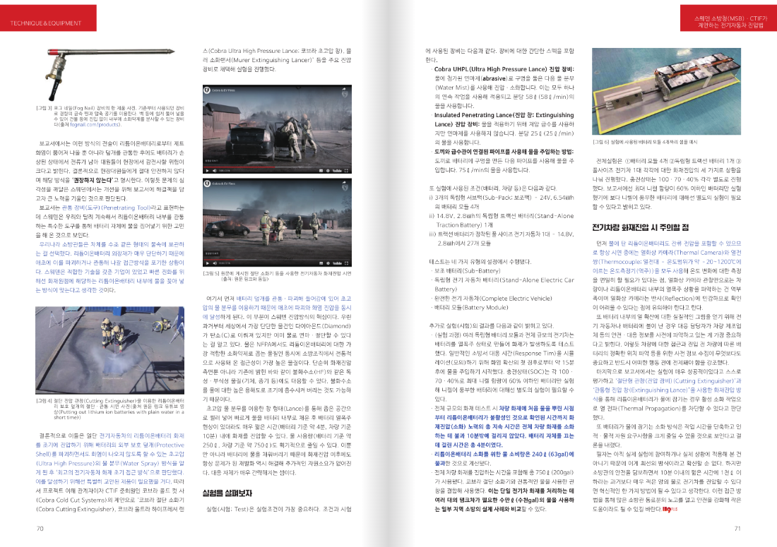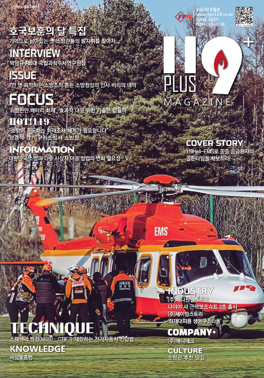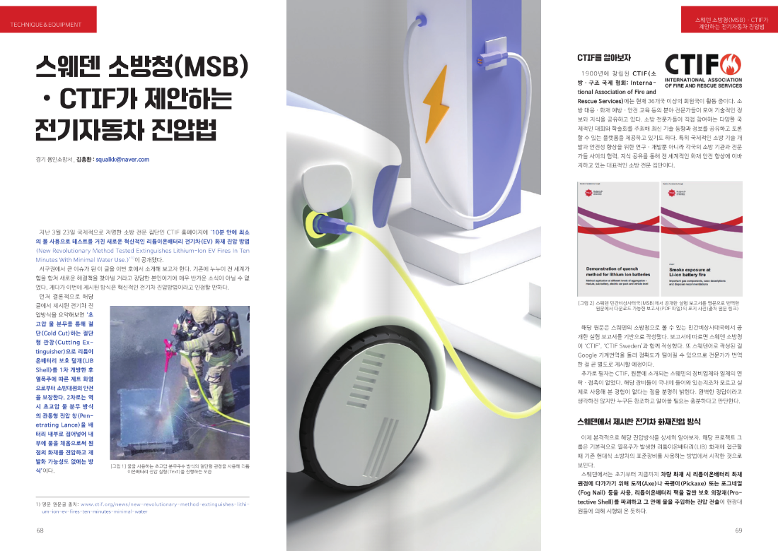 119PLUS(119플러스) 2023년 6월호에 연재된 '스웨덴 소방청과 CTIF가 제안하는 전기자동차 진압법'이라는 내용에는, 결론적으로 전기자동차 화재진압을 위한 혁신적인 방법으로 뮬러랜스와 같은 관통형 진압창을 추천하고 있습니다.