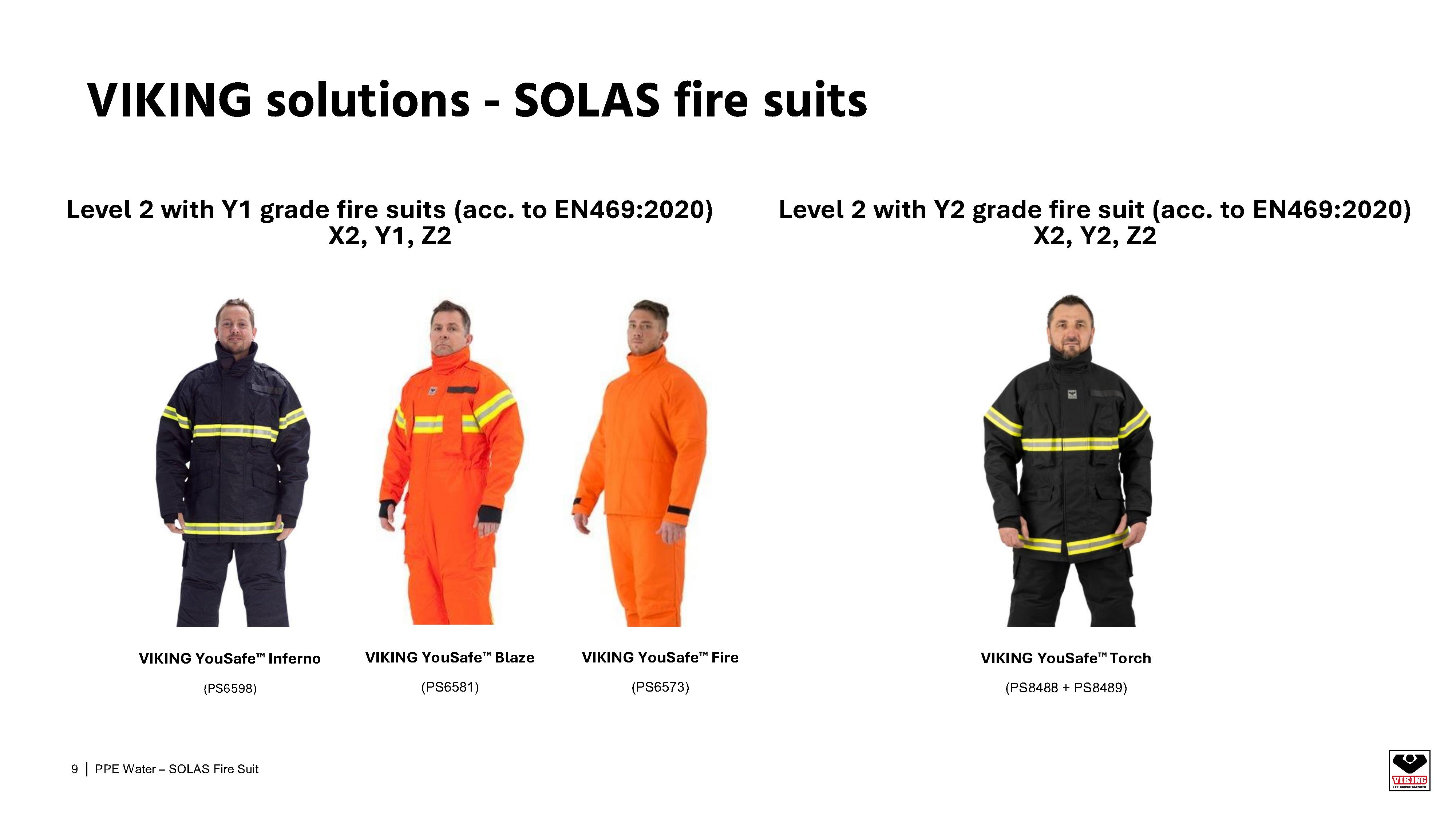 하오나, 바이킹의 SOLAS 방화복 (해상용 방화복)은 모두 'Level 2(레벨2, X2) with Z2 Grade'의 성능을 보유한 SOLAS MED 승인 제품입니다.