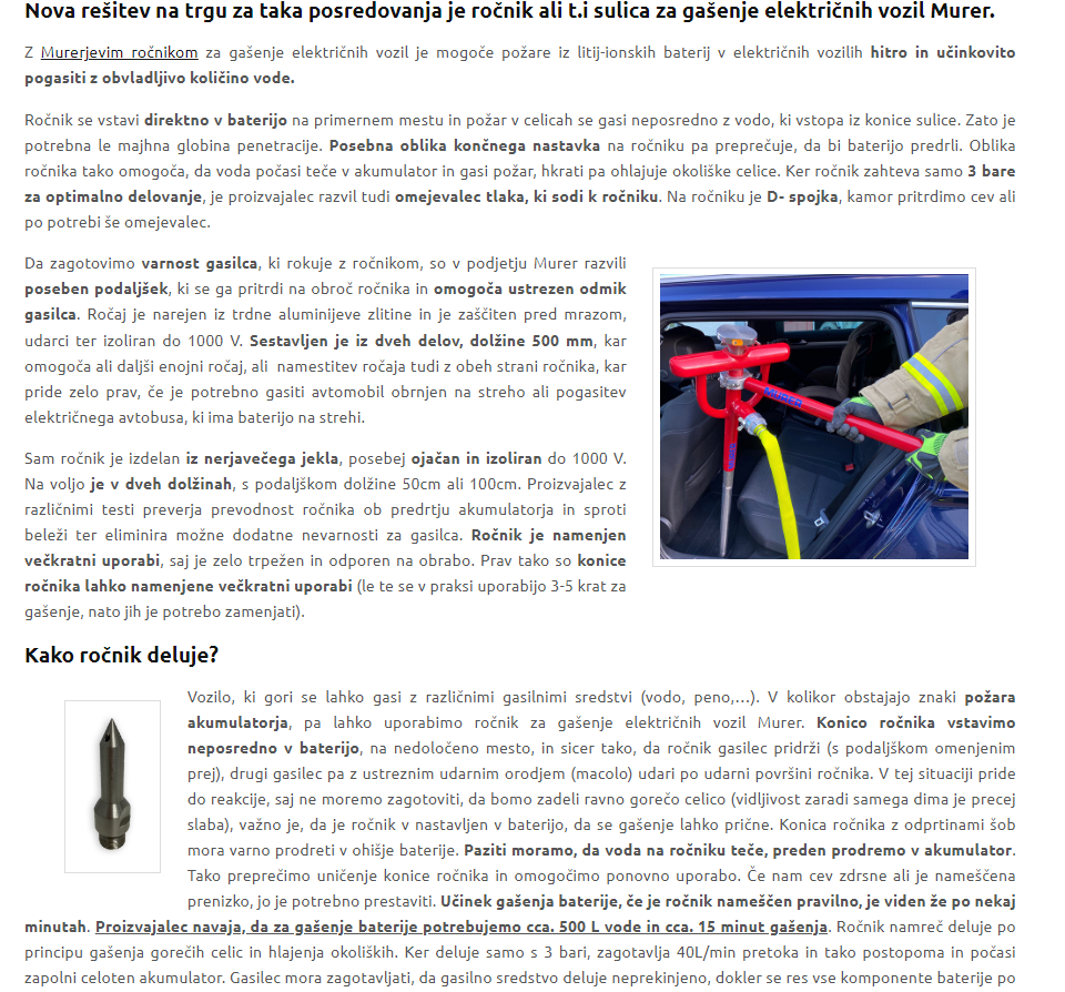 유럽연합 슬로베니아의 전문 소방장비업체에서 증가하고 있는 전기차 보유율과 그에 연계되는 전기차화재율을 설명하면서, 현재 운영중인 질식소화포와 수조방식의 불합리함에 비교하여 뮬러랜스의 현장 적합성을 적극 설명하고 있습니다.