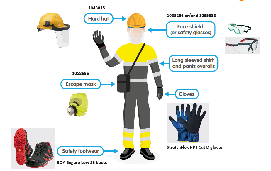 SGMF에서는 안전헬멧, 헬멧 바이져, 고글, 장갑, 안전화와 피부가 노출되지 않는 작업복 착용을 권고하고 있으며, 가장 중요한 사항은, 비상시 탈출을 위해서 착용할 수 있는 탈출용 마스크 (full face type)를 상시 휴대할 것을 권고하고 있습니다.