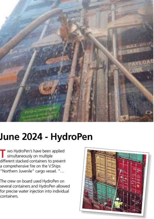 2024년 6월, 컨테이너선박내 컨테이너 화재를 하이드로팬을 이용하여 해결하였습니다. 해당 선박은 일정에 맞추어 계속 운항을 하였으며, 하이드로팬으로 진화된 컨테이너는 입항하여 하선되었습니다.
