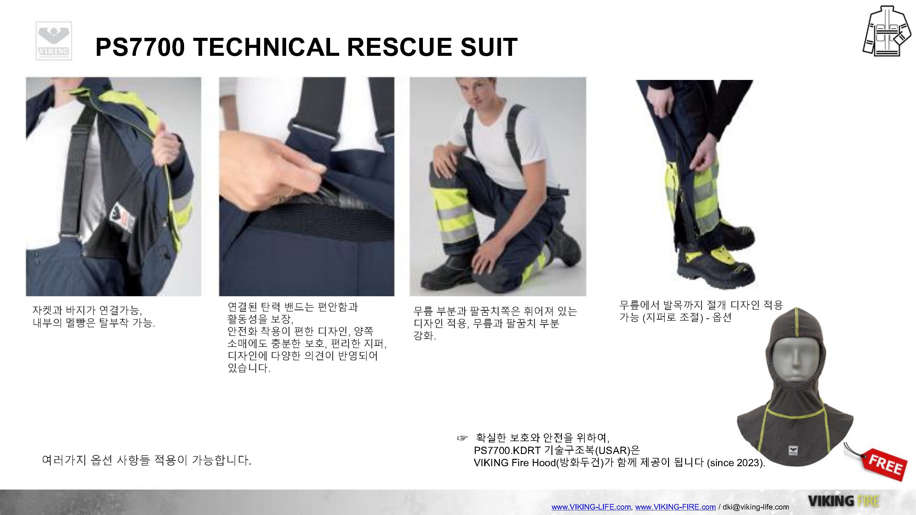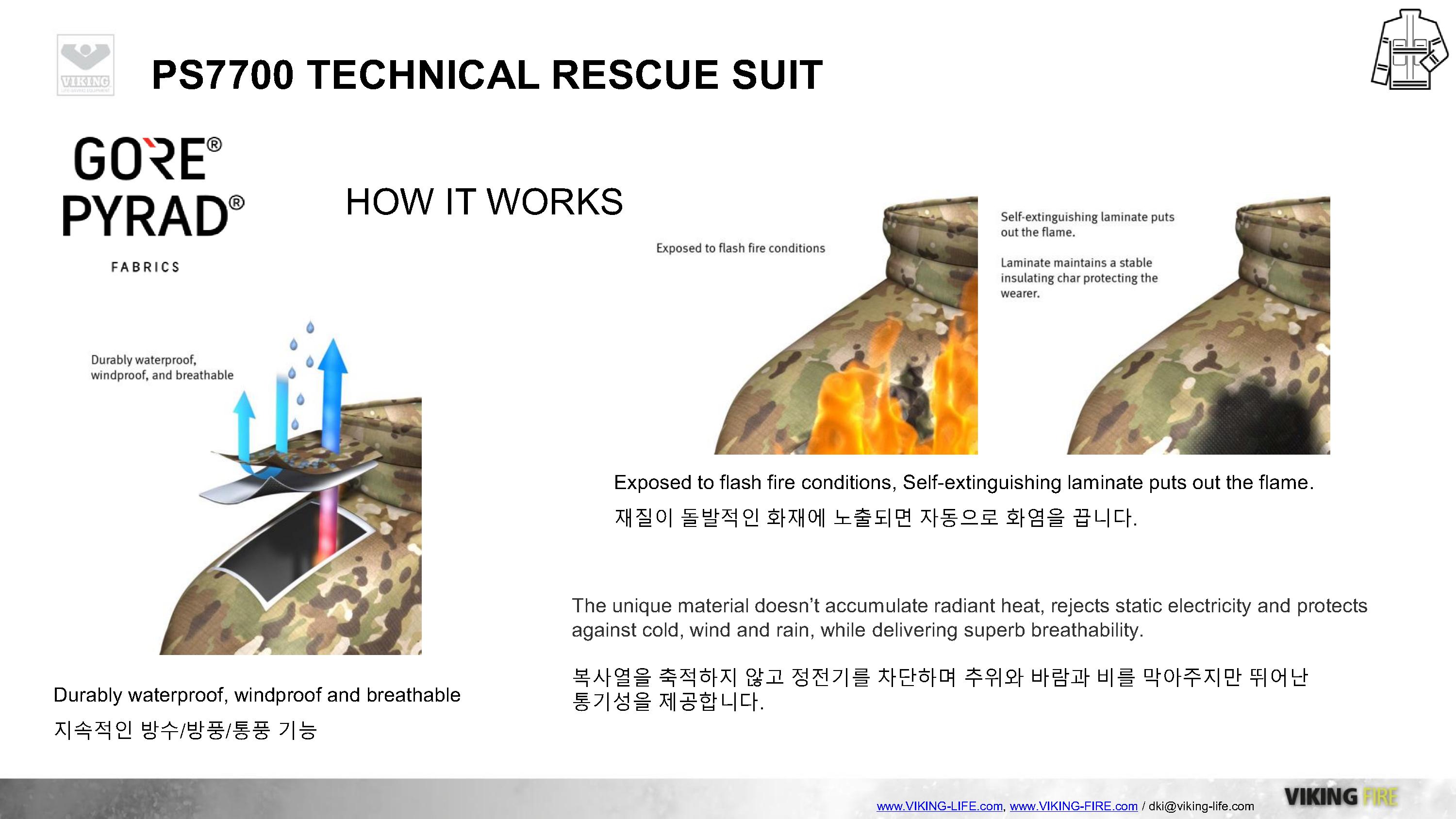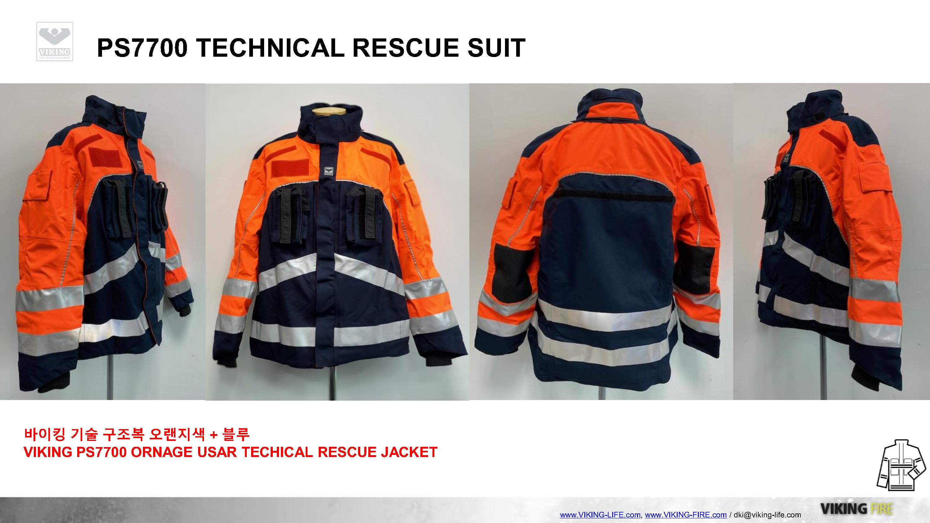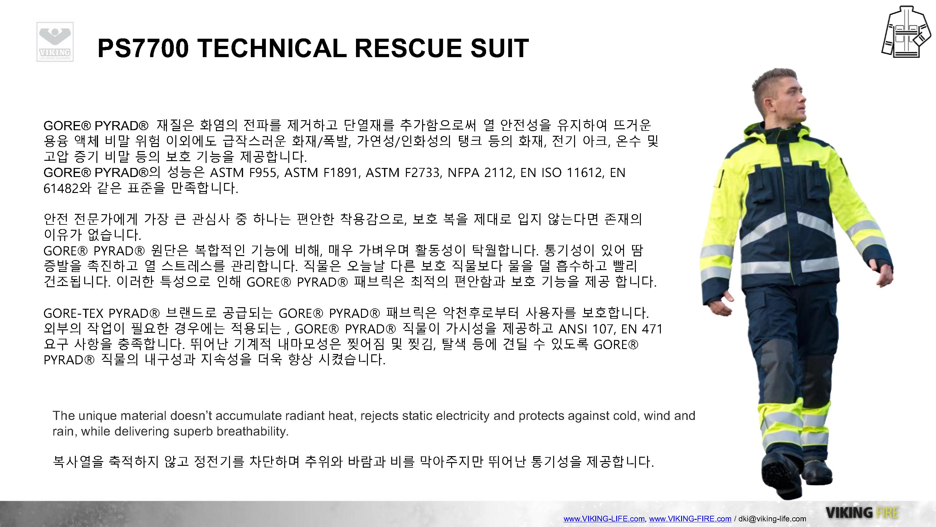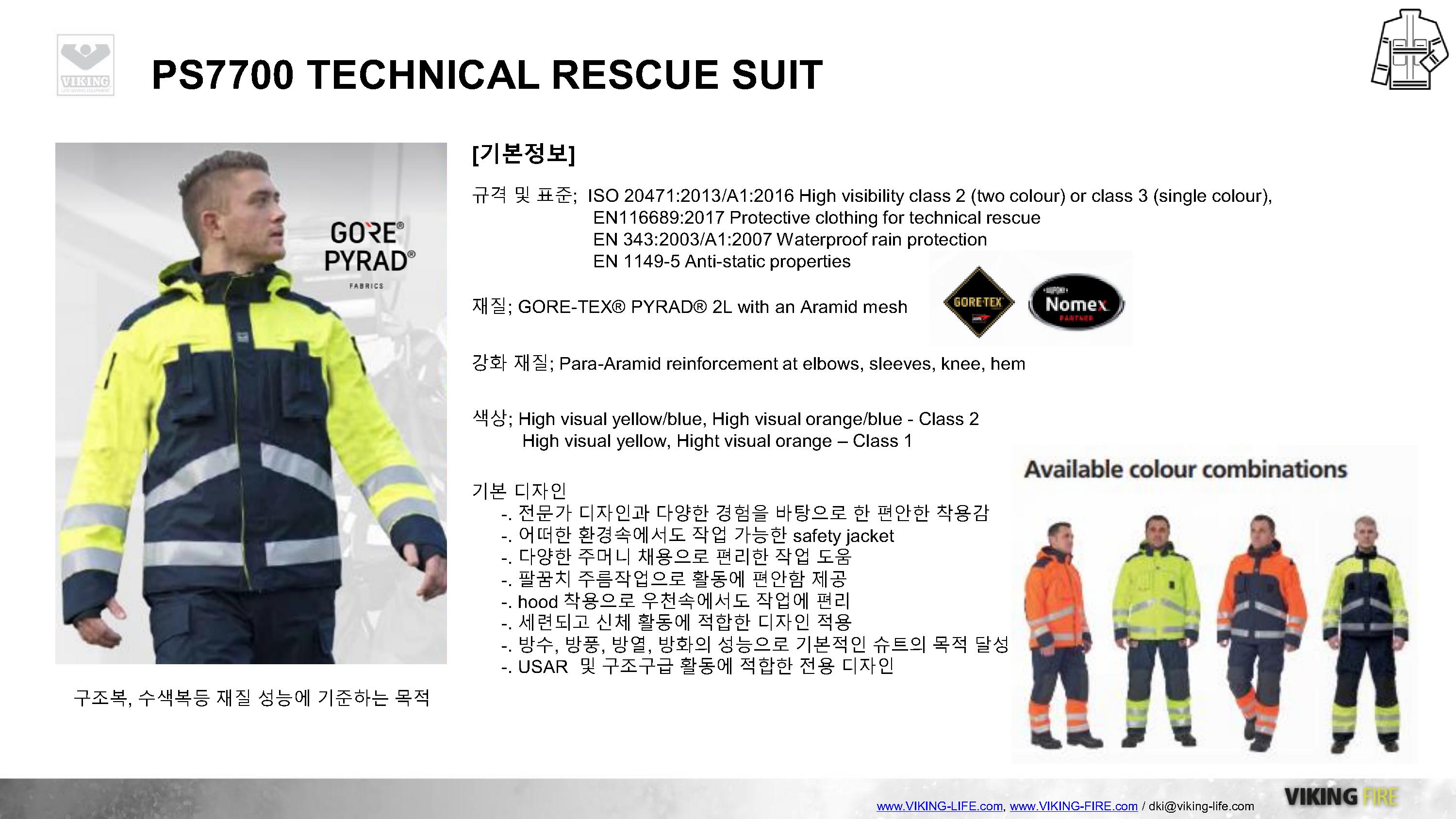 VIKING과 GORE의 만남, 도시탐색구조복 및 기술구조복의 새로운 패러다임을 제시하는 VIKING PS7700 구조복은 GORE-TEX PYRAD를 적용하여 방수/방풍/방열/방화성능을 기본적으로 갖추고 있으며, 매우 가볍고 실용적인 디자인으로 긴급구조대 및 도시탐색구조대의 활동복으로 충분한 역할을 하고 있습니다.