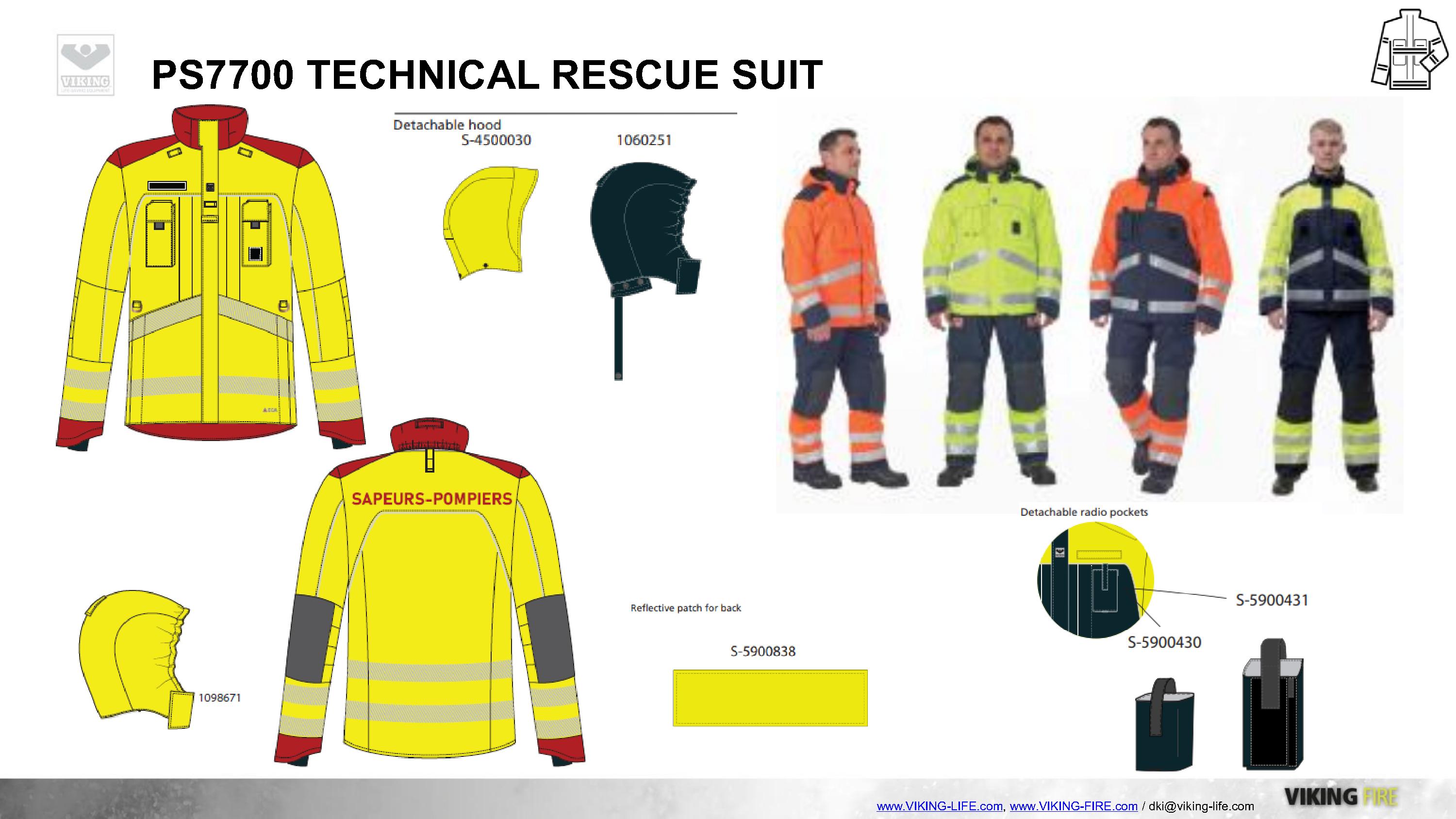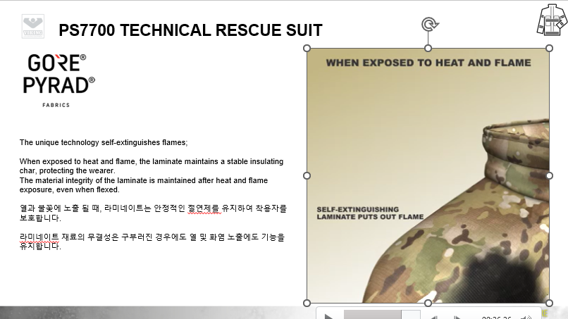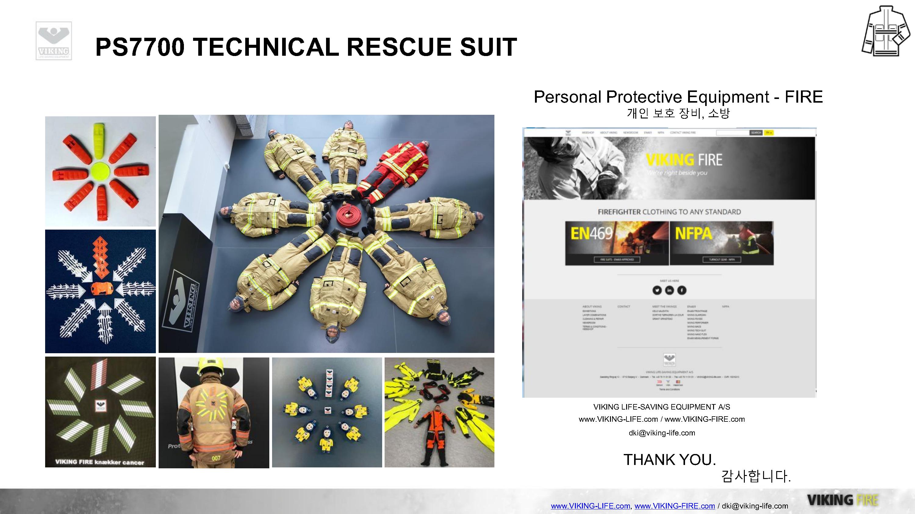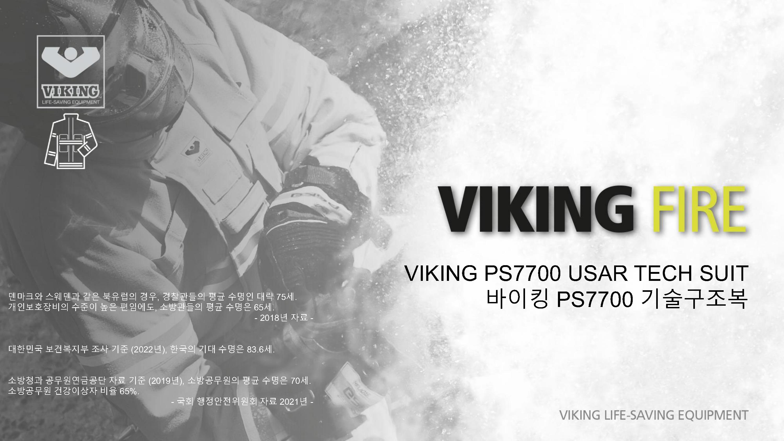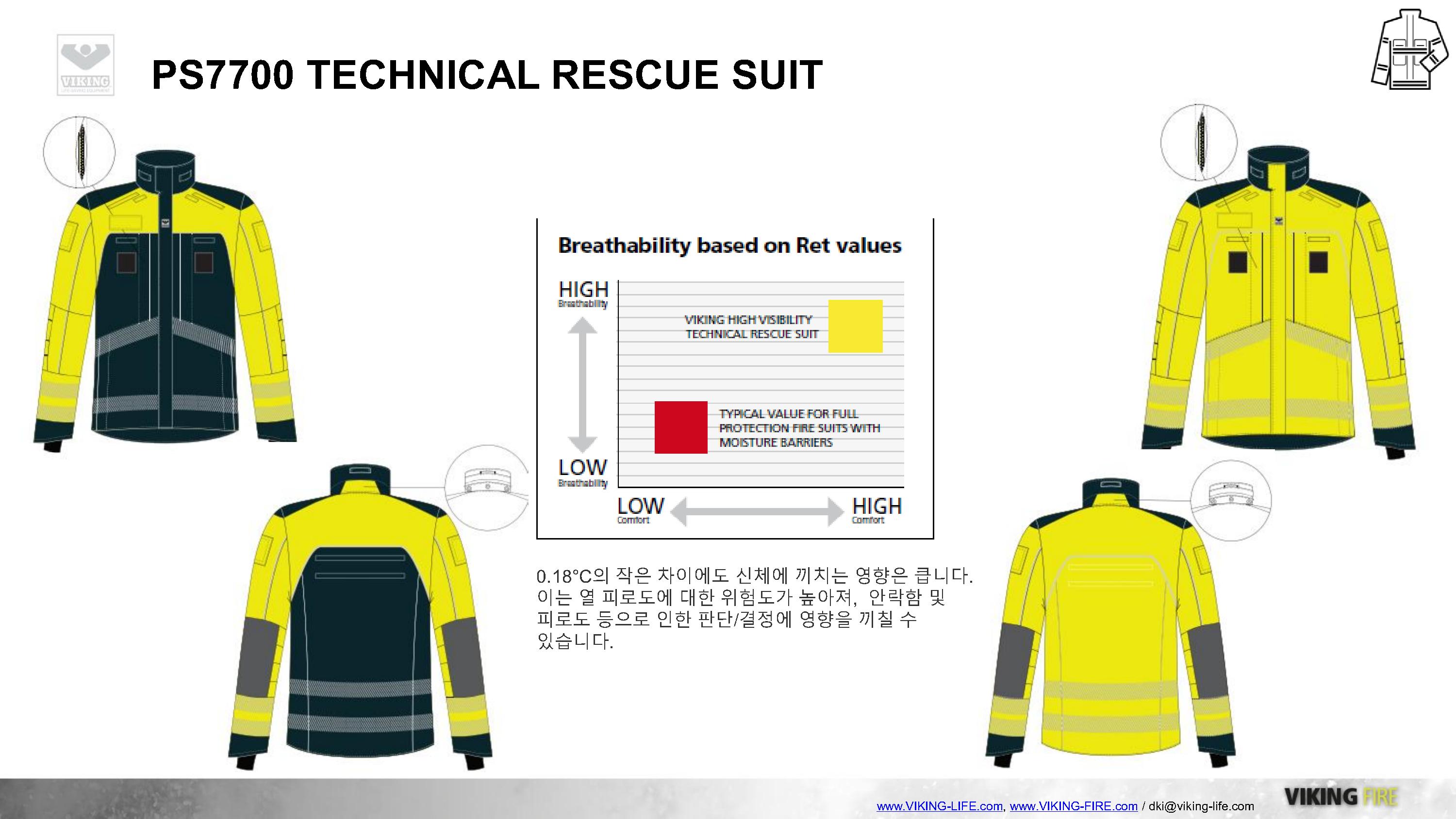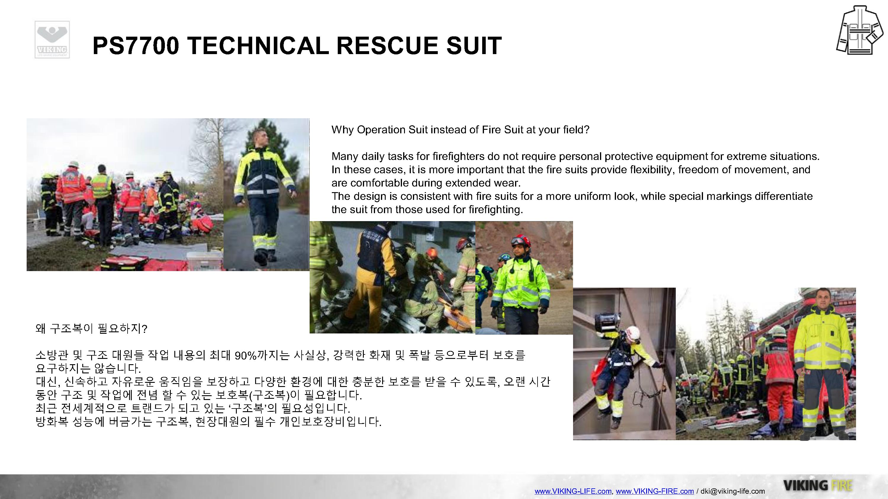VIKING과 GORE의 만남, 도시탐색구조복 및 기술구조복의 새로운 패러다임을 제시하는 VIKING PS7700 구조복은 GORE-TEX PYRAD를 적용하여 방수/방풍/방열/방화성능을 기본적으로 갖추고 있으며, 매우 가볍고 실용적인 디자인으로 긴급구조대 및 도시탐색구조대의 활동복으로 충분한 역할을 하고 있습니다.
