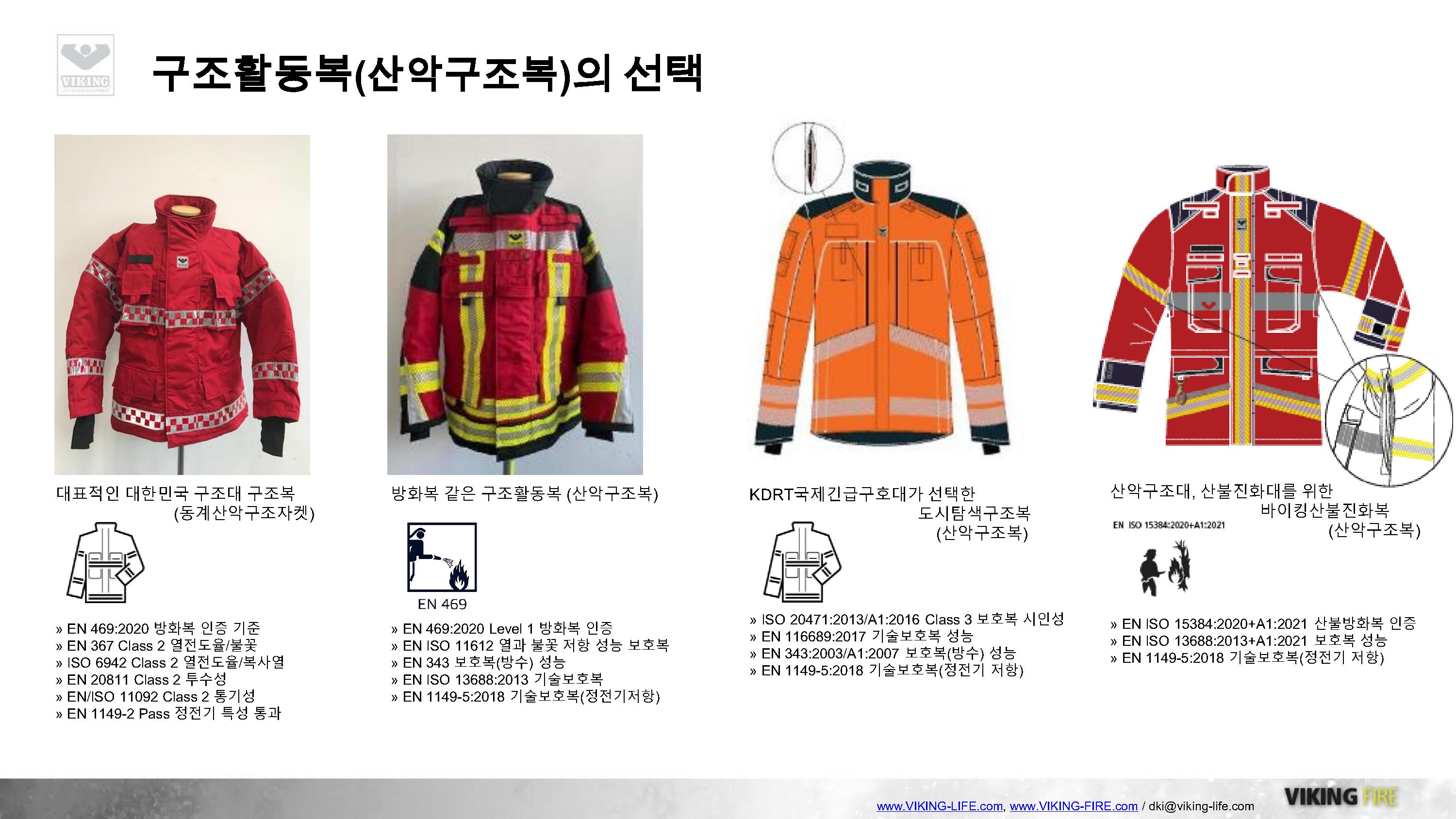 전국 대다수 구조대원의 대표적인 동계산악구조복인 바이킹 PS1000 빨간 구조자켓은 동계용 자켓으로 기준하고, 방화복같은 구조활동복인 바이킹TH와 국제긴급구호대(KDRT)가 선택한 도시탐색구조복, 최근에 출시된 산불진화구조복 바이킹 WTR은 대한민국 구조대원들의 산악구조복/일반구조복을 위한 선택의 폭을 넓혀주고 있습니다.