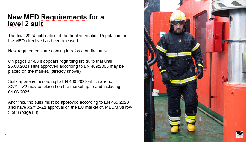 2025년 6월 4일 이후부터는 EN469:2020 기준 승인된 해상용 방화복의 'X2/Y2/Z2'의 'Level 2' 방화복만 사용이 가능합니다.