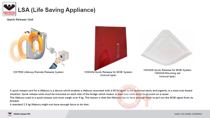 -. Lifebuoy Auto Release System(구명부환 발사체)는 4.3kg 이상의 Lifebuoy와 설치될 수 있으나, 자동방식 또는 수동방식, 또는 필요치 않을 수 있기에, 전적으로 구매자(선주사) 요구 사항에 따라서 적용됩니다.