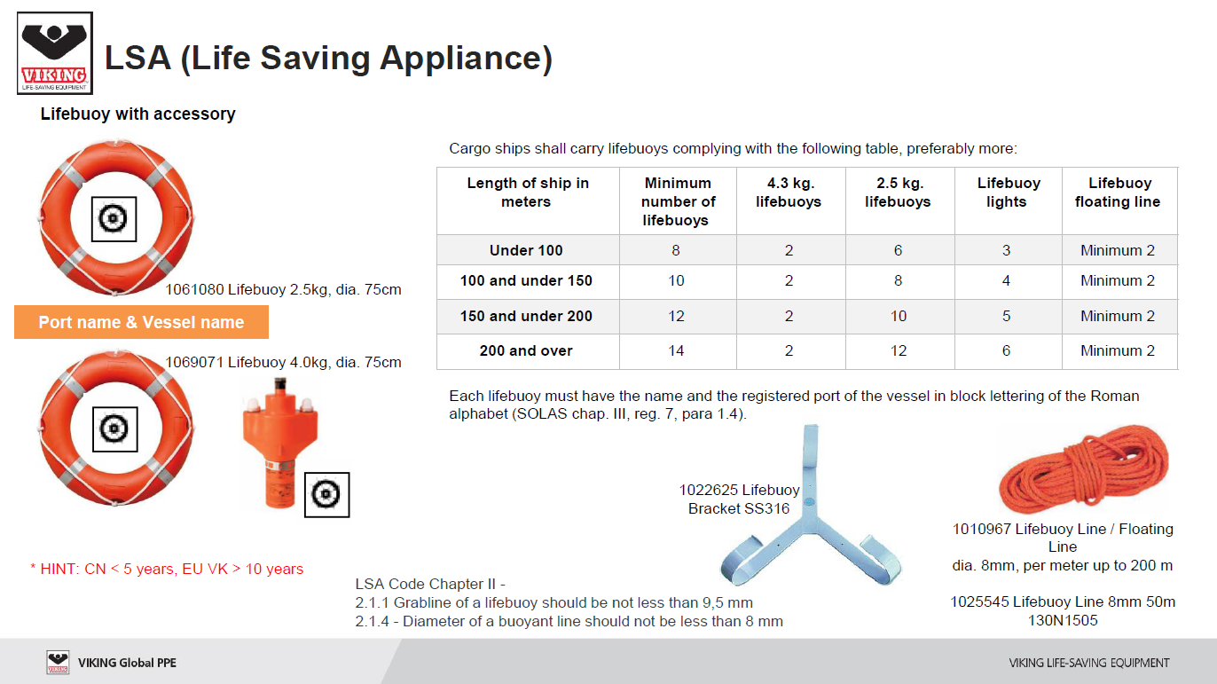 선박 운항 경험에 따르면, 중국산 Lifebuoy는 대략 5년 이내에 교체가 필요할 정도로 상태가 변형되지만, 바이킹 표준 모델은 10년 이상동안 교체가 필요치 않을 정도의 성능을 유지하고 있음을 확인할 수 있었습니다.
